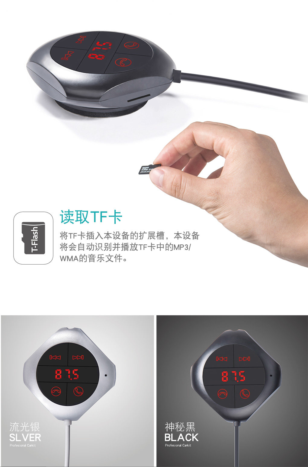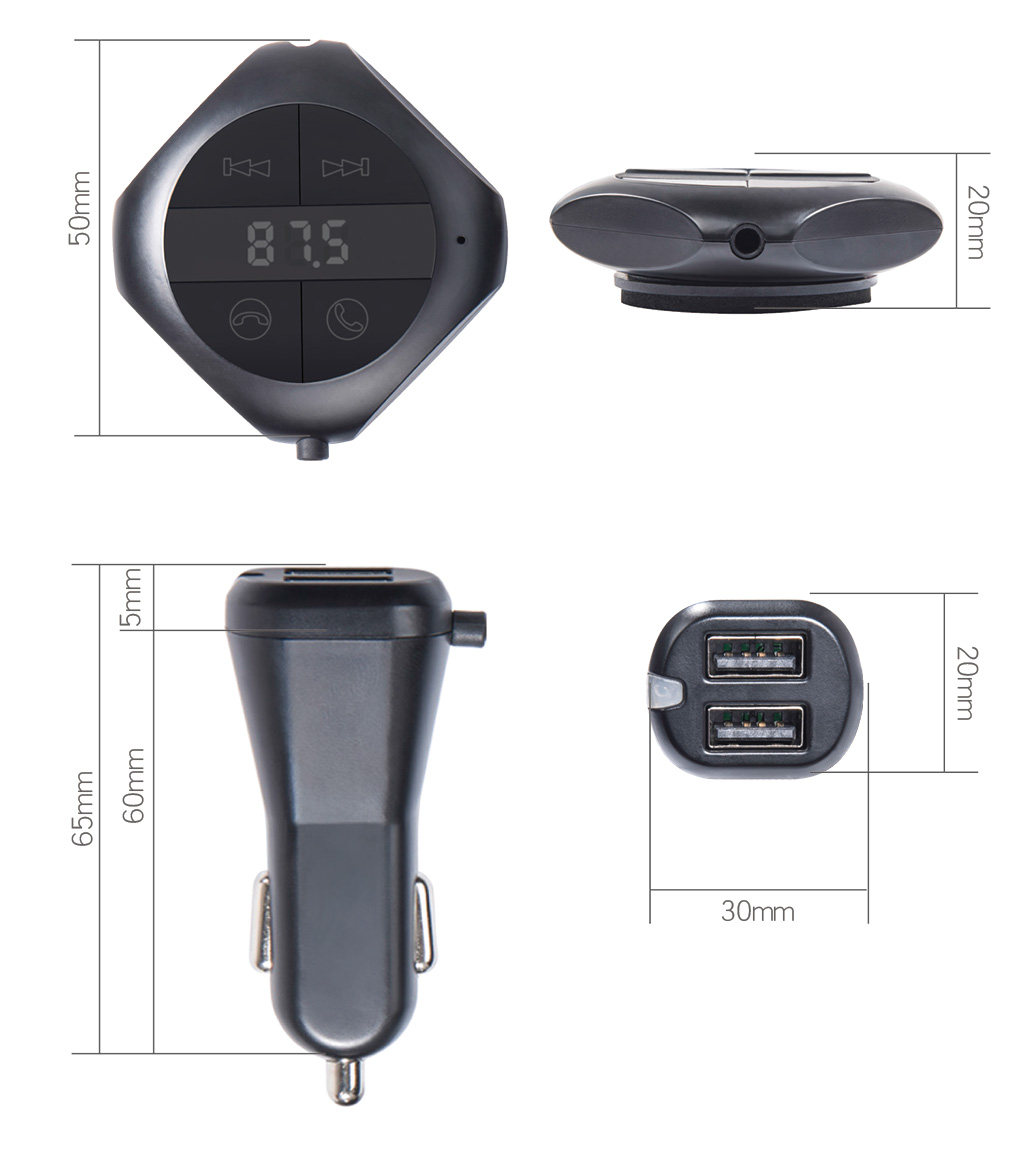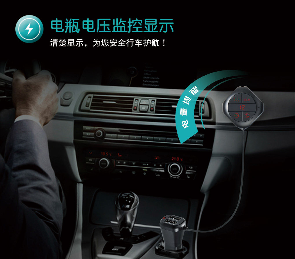 本產品具有FM發射器,車載藍牙免提,車載MP3, 車載USB充電器插卡識別音頻輸出等各種功能。