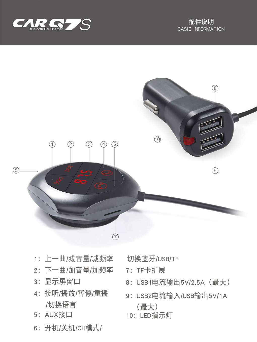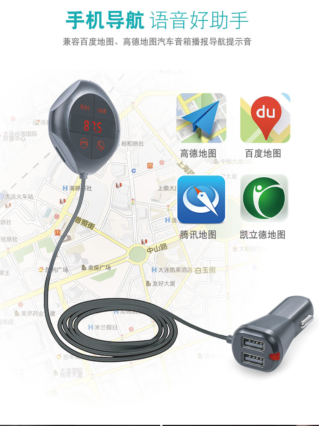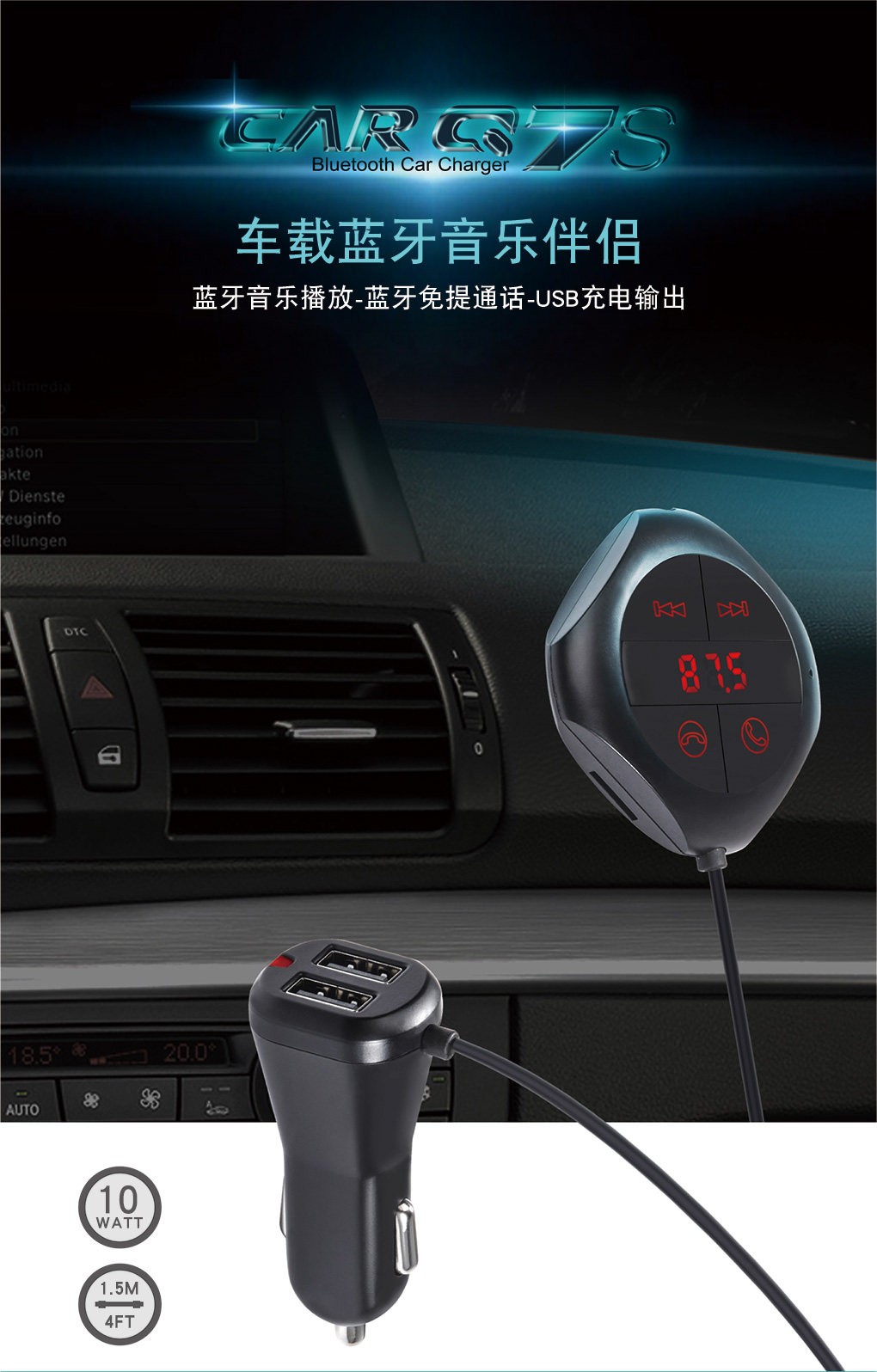 本產品具有FM發射器,車載藍牙免提,車載MP3, 車載USB充電器插卡識別音頻輸出等各種功能。