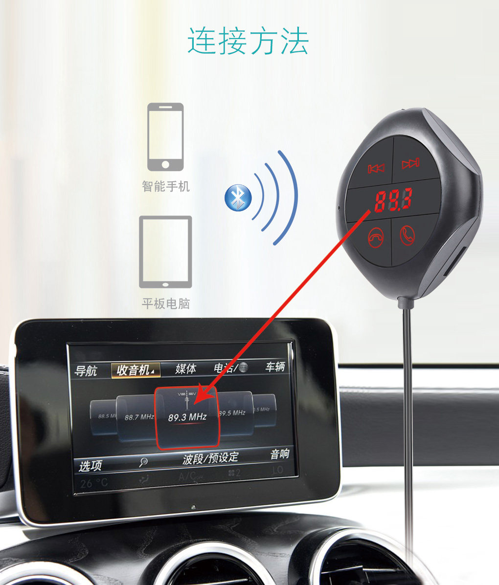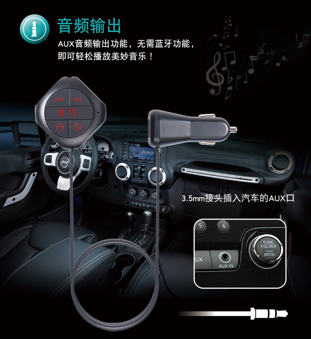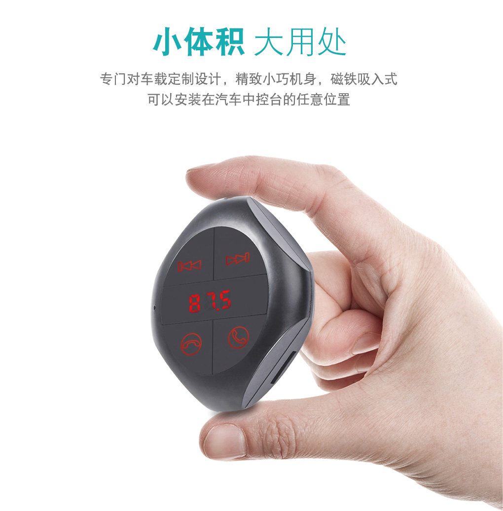 1:車載藍牙fm發射器:將手機、U盤、TF卡、MP3里面的音樂傳送到汽車音響播放。