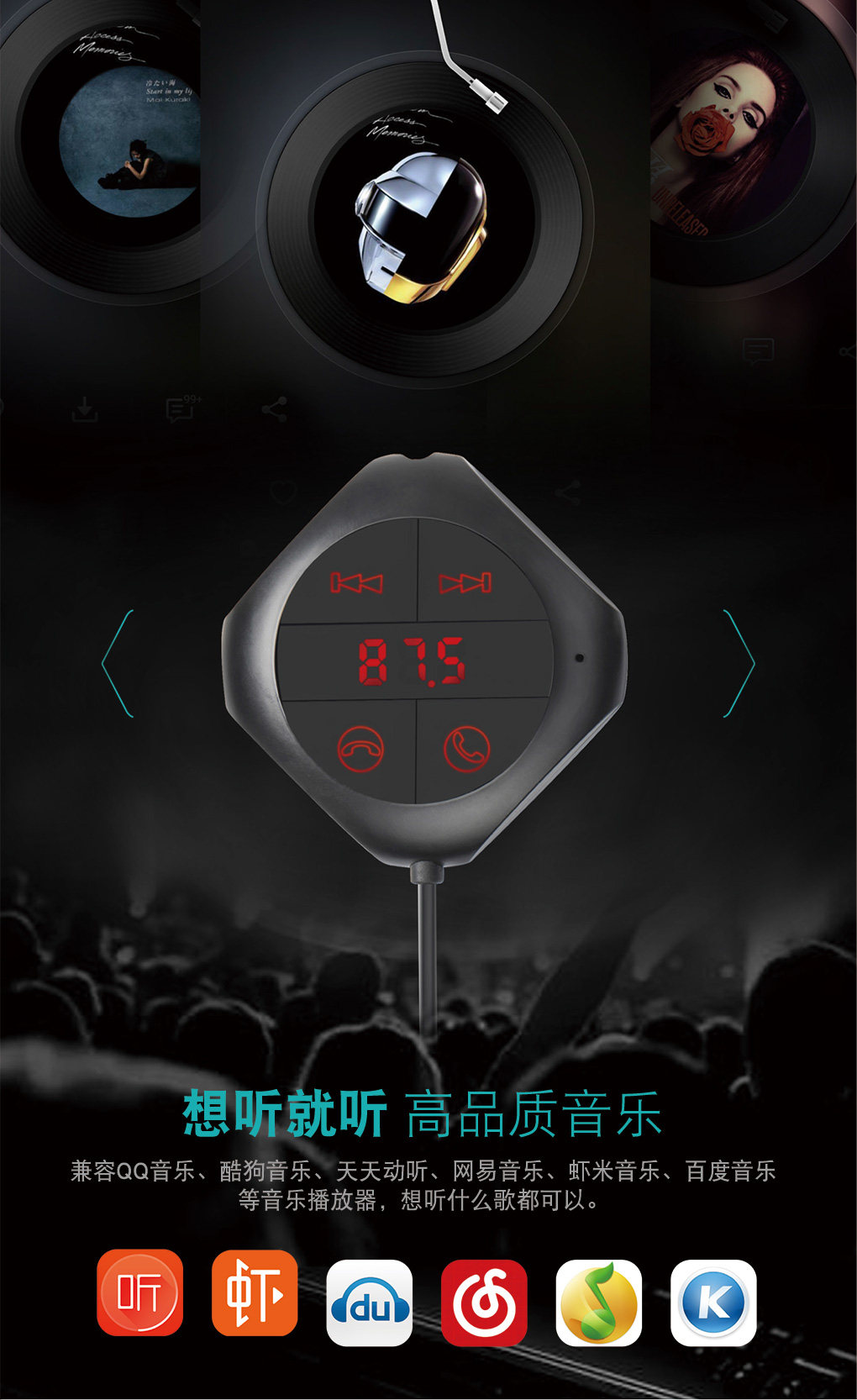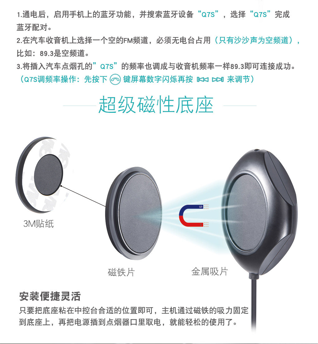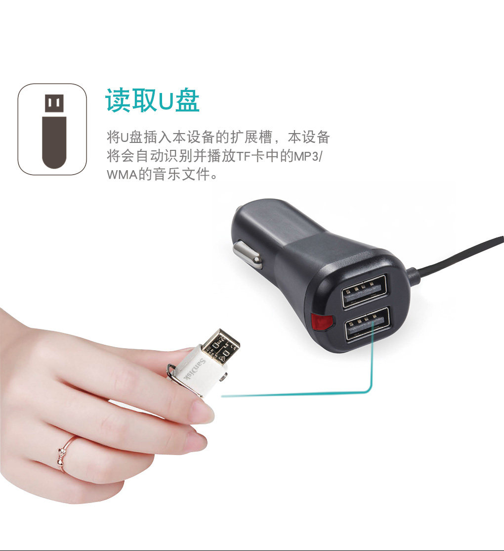 1:車載藍牙fm發射器:將手機、U盤、TF卡、MP3里面的音樂傳送到汽車音響播放。