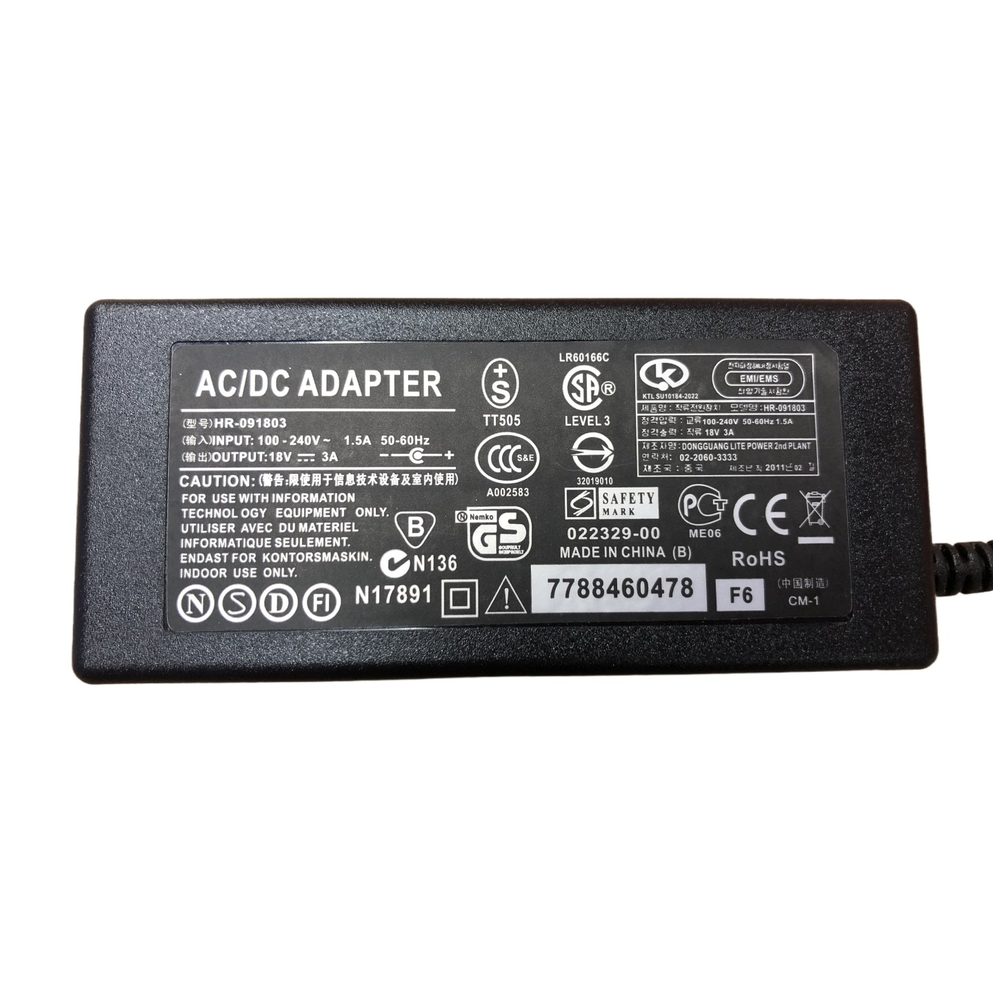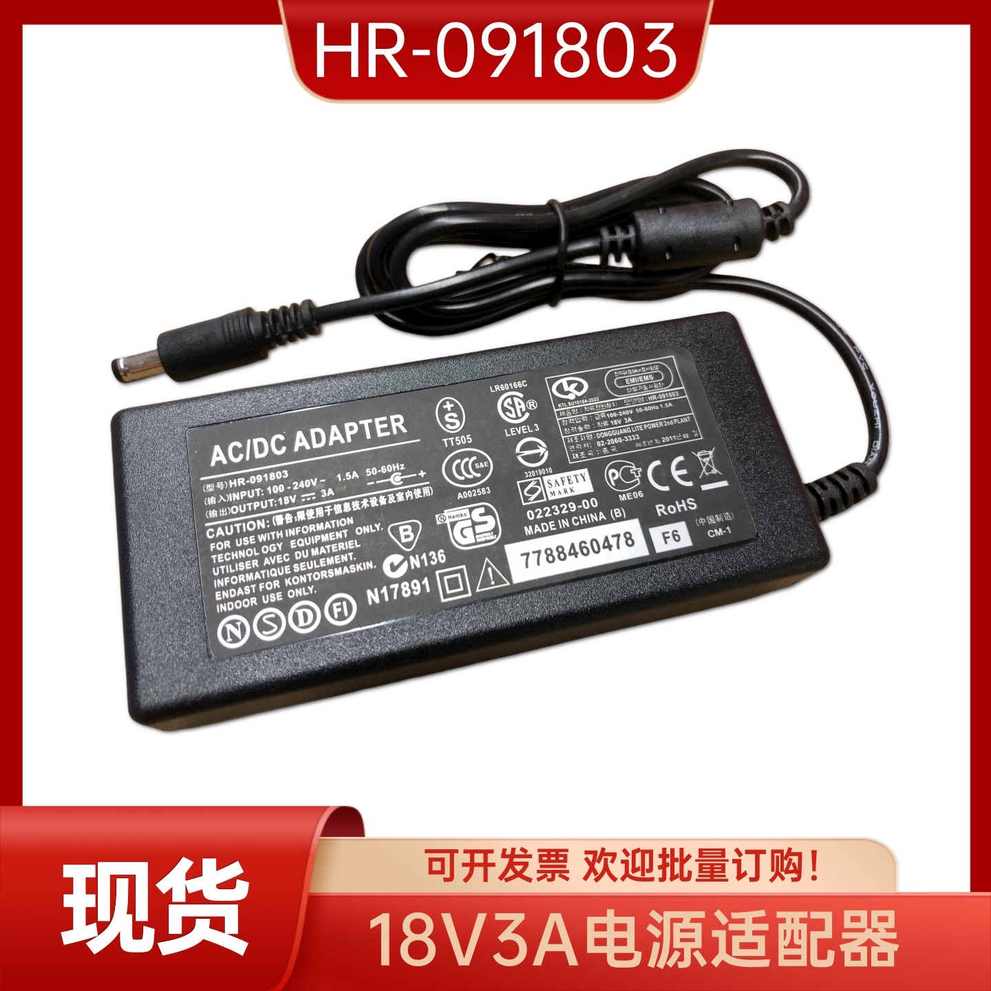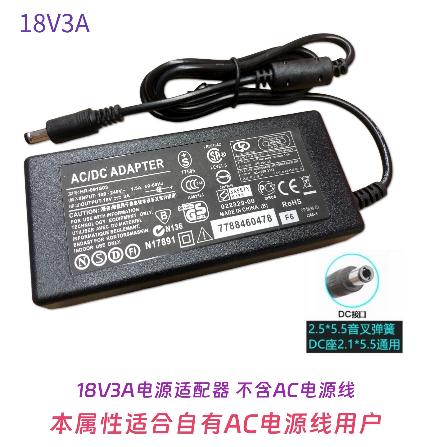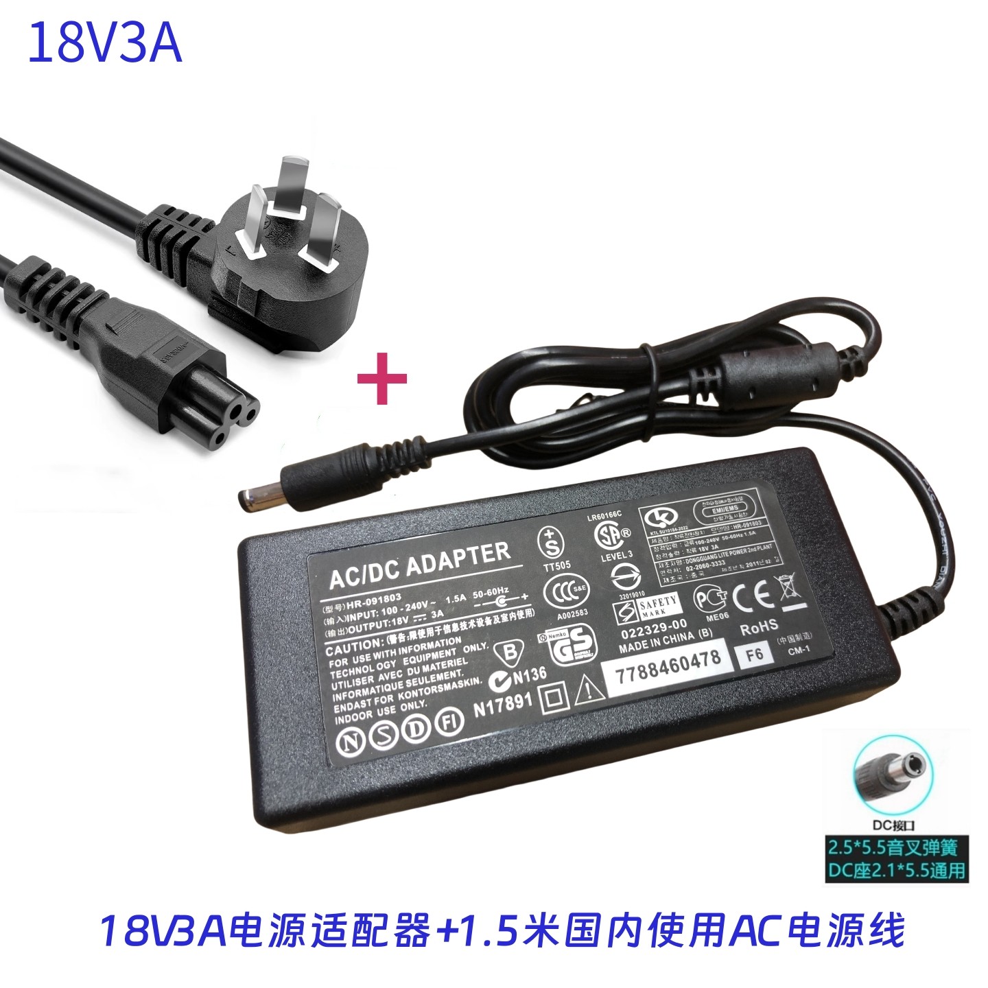 18V3A電源適配器型號:HR-091803參數:輸入電壓:AC100-240V 50/60HZ ;輸出電壓:DC18V輸出電流:3A 輸出功率:54WDC接口尺寸:2.5mm(內徑)*5.5mm(外徑)音叉帶夾,適合2.1*5.5使用。DC線長度:1.2米圓線帶磁環。帶指示燈18V2A適用