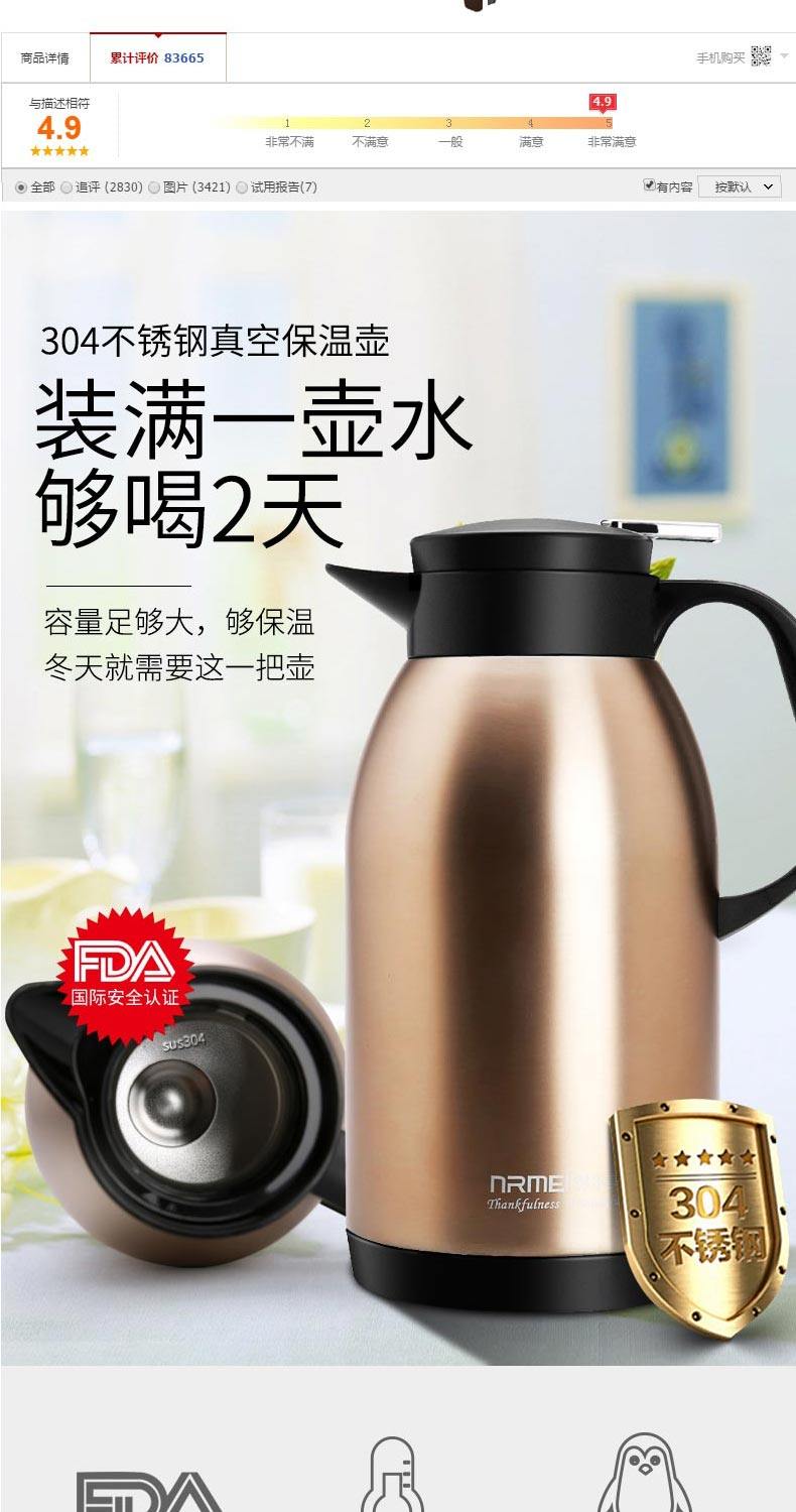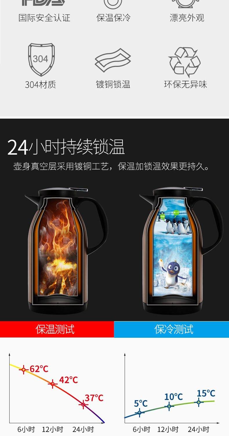 現代科技感十足的保暖水壺,拋光的金屬面擁有著現代家庭日用品的完美曲線。304的不銹鋼材質,讓水容器更安全可靠。2L,2.5L的大容量,能夠滿足全家人的使用。內部優質的硅膠防滑圈,確保了水壺的密封性。6層的緊密工藝涂層,能夠完美實現保溫保冷的功能,單手開合,使用更方便。