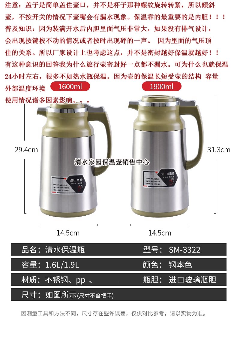 【溫馨提示】買家在收到新的保溫瓶時"千萬注意"用溫水清洗瓶膽后,再灌進熱水.千萬不能直接用冷水清洗后就馬上灌進開水,這樣急冷急熱瓶膽熱脹冷縮很容易爆裂哦,請買家千萬注意!!!