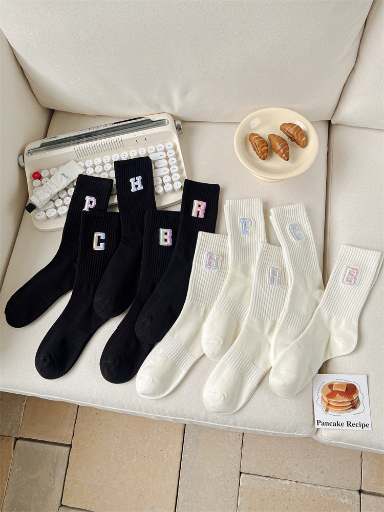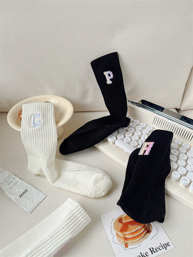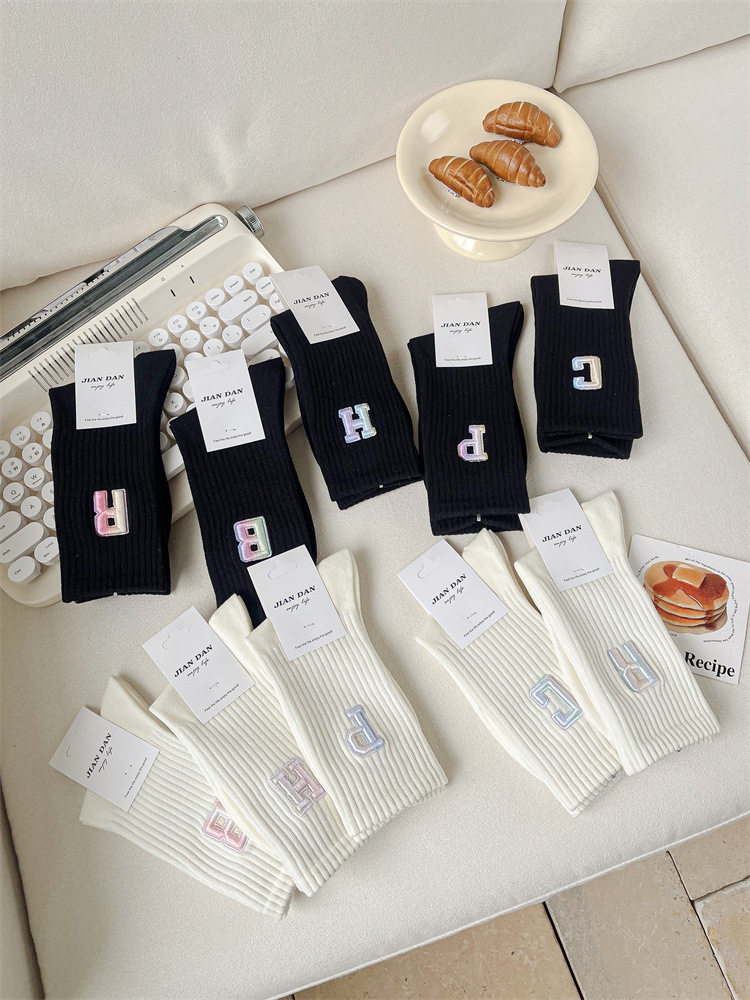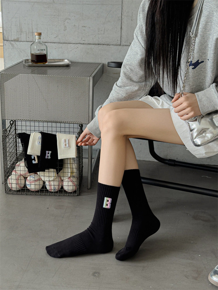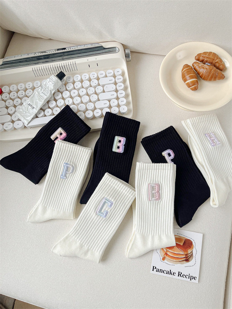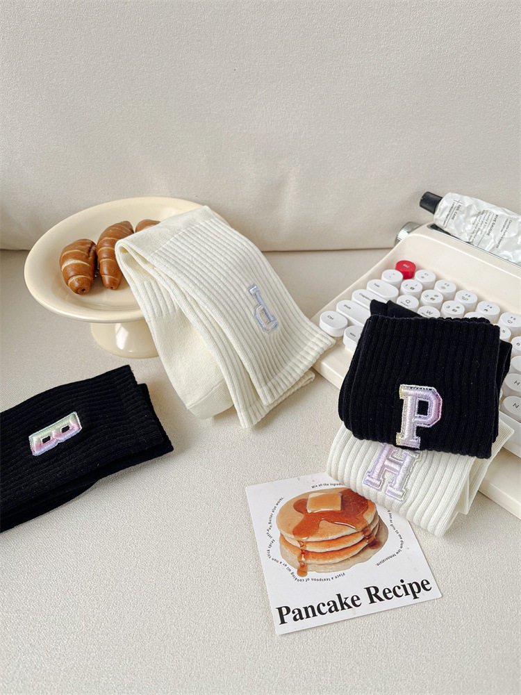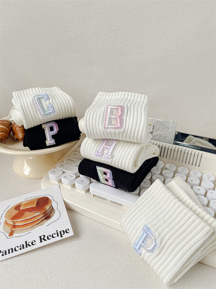 英文立體漸變色刺繡高筒女襪