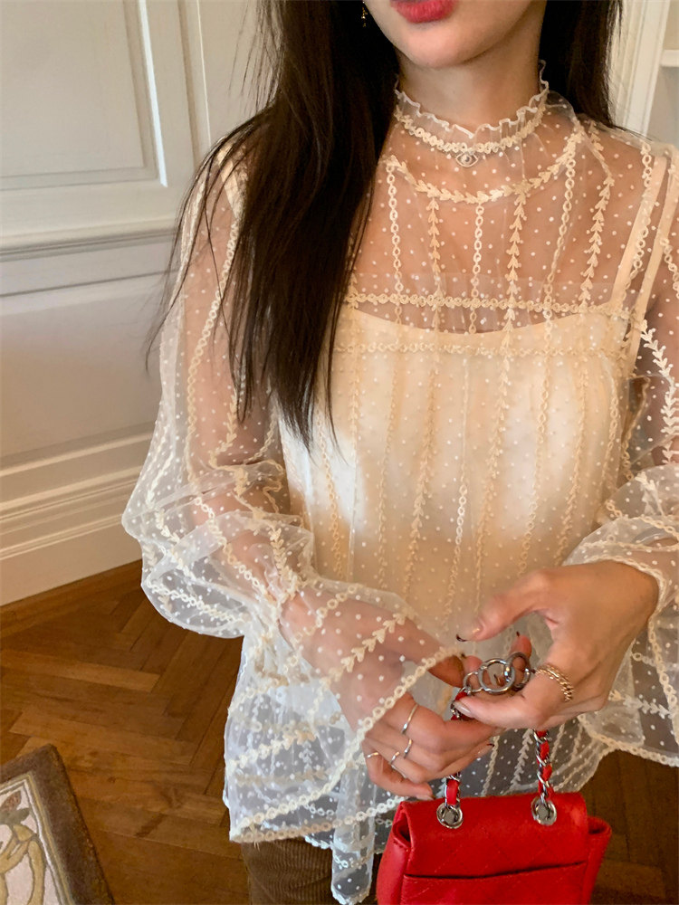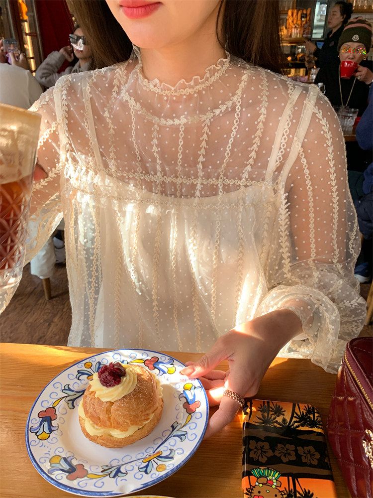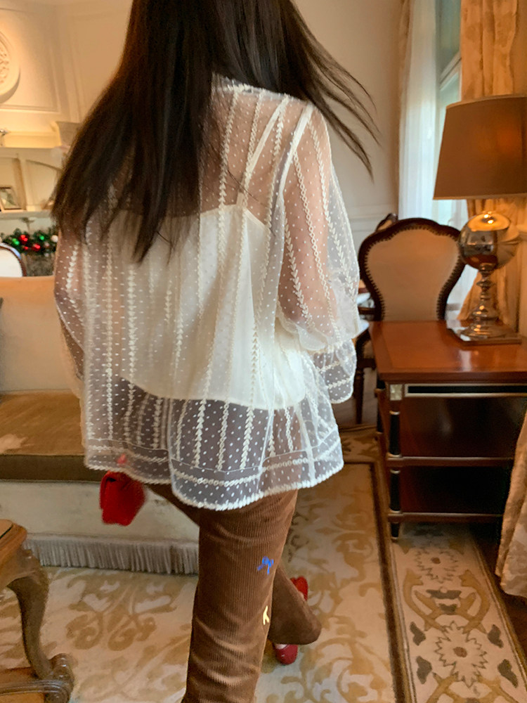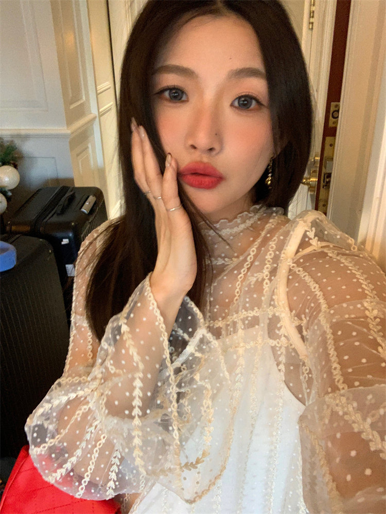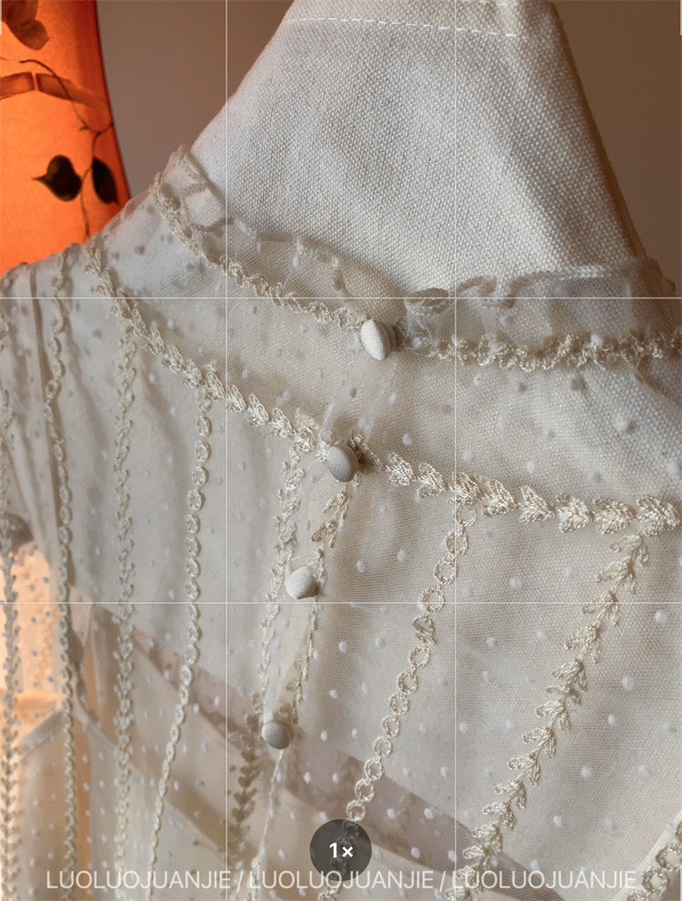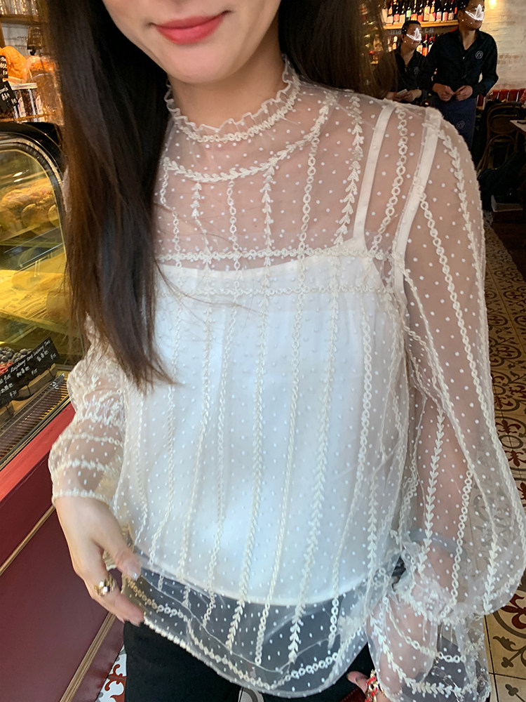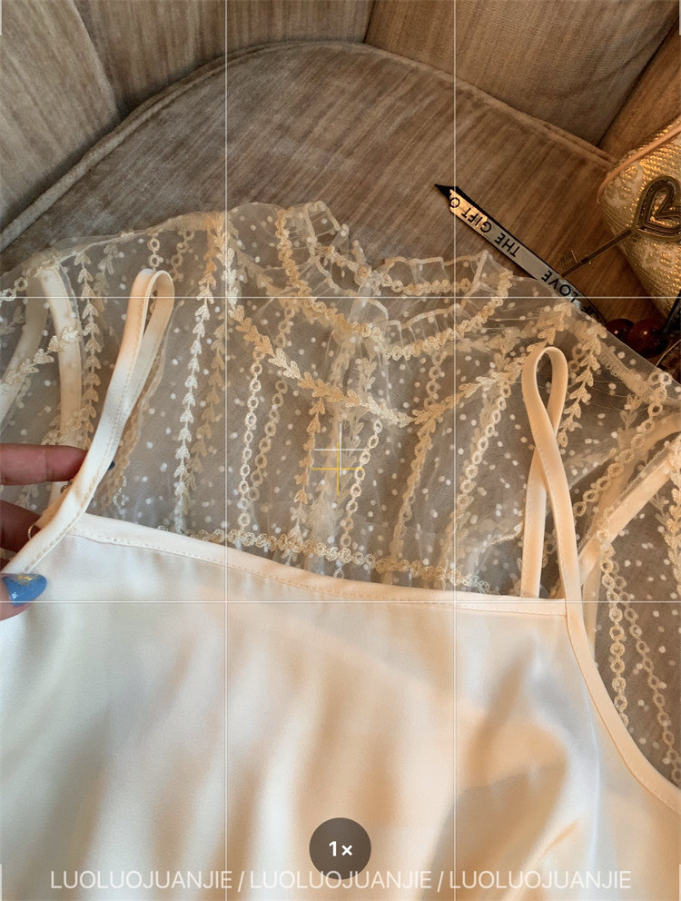 外層的襯衫采用的是網紗刺繡蕾絲面料,比較密實!