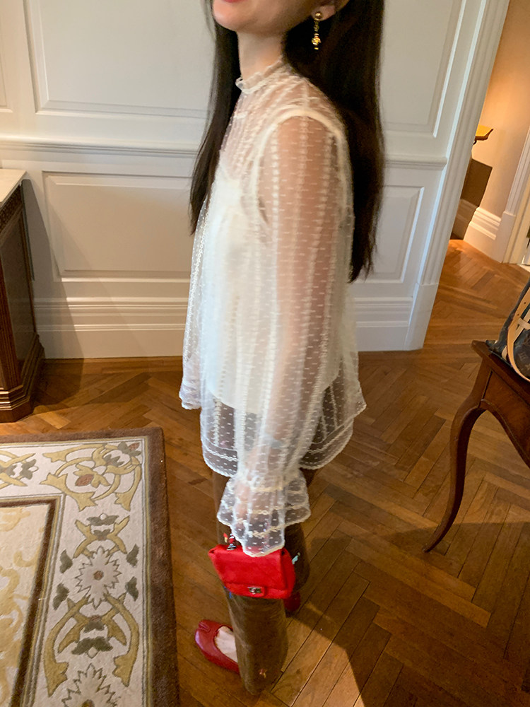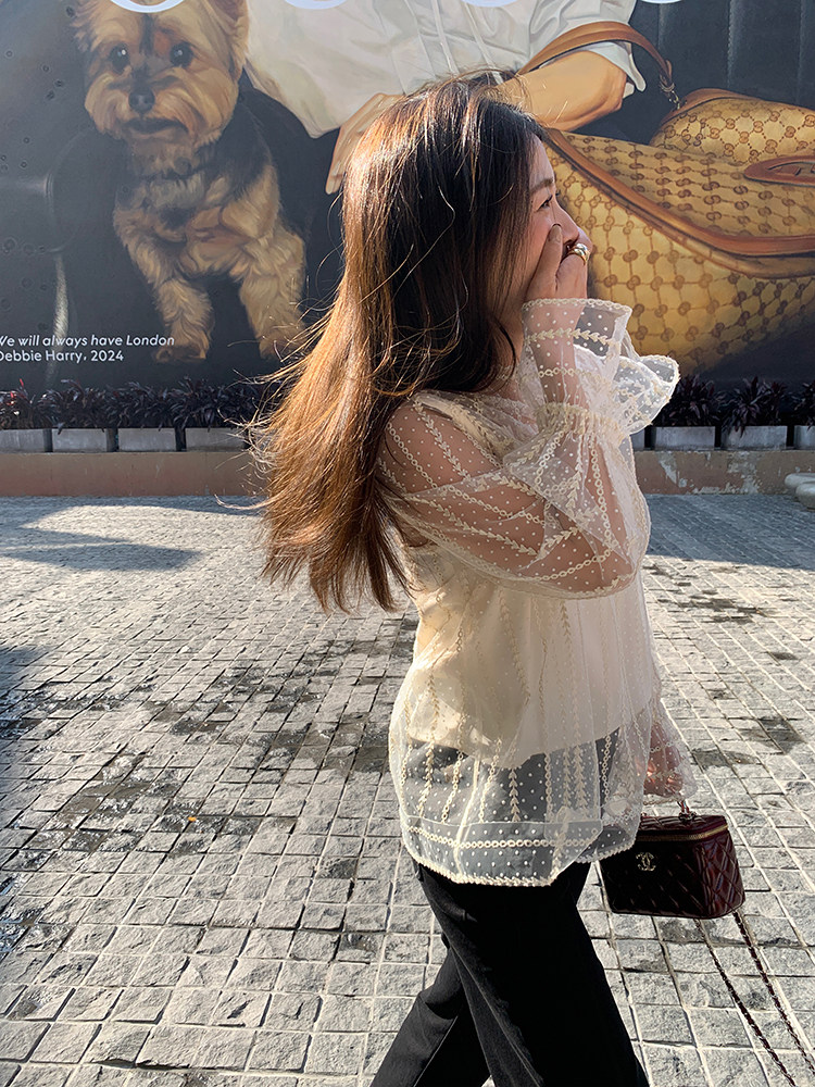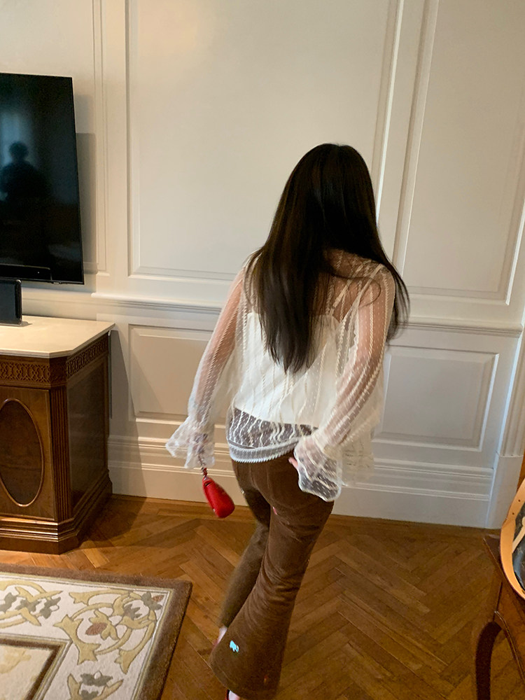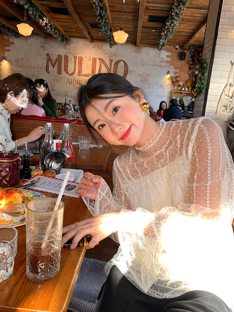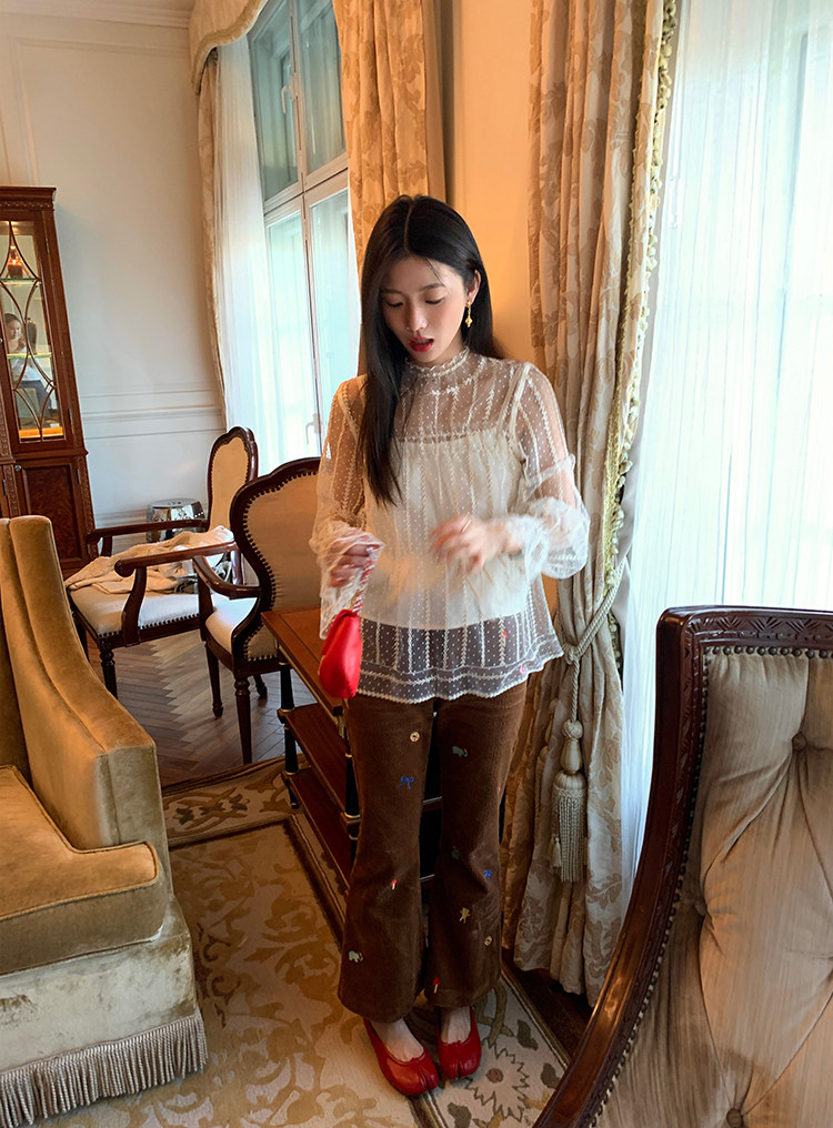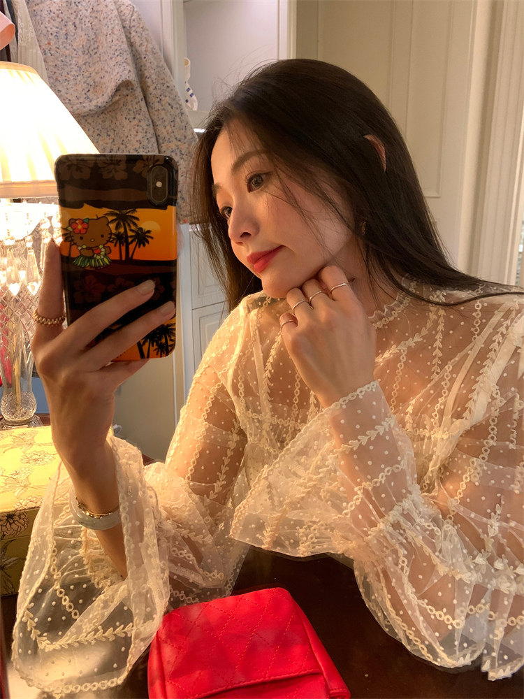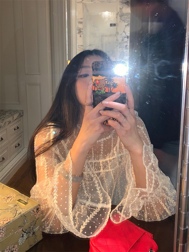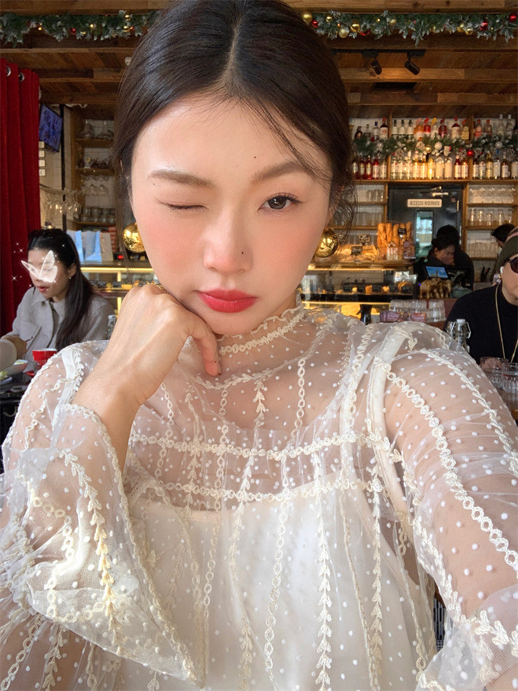 外層的襯衫采用的是網紗刺繡蕾絲面料,比較密實!