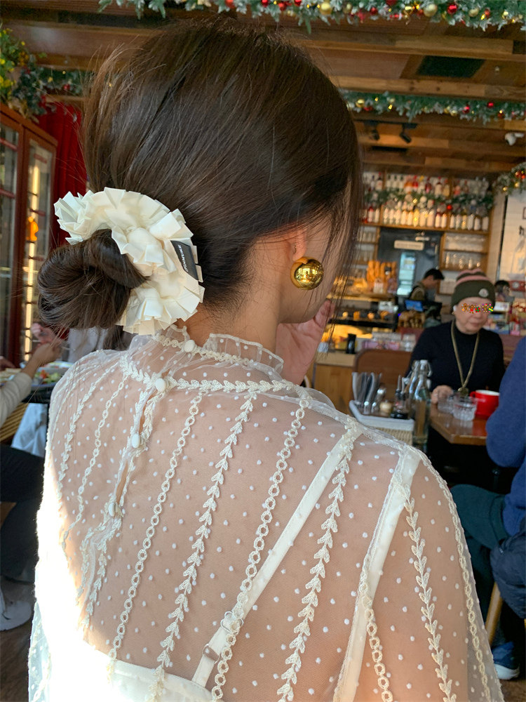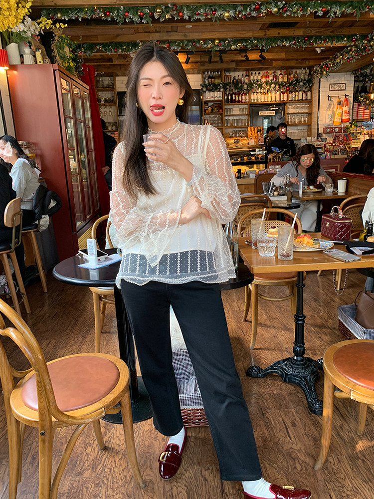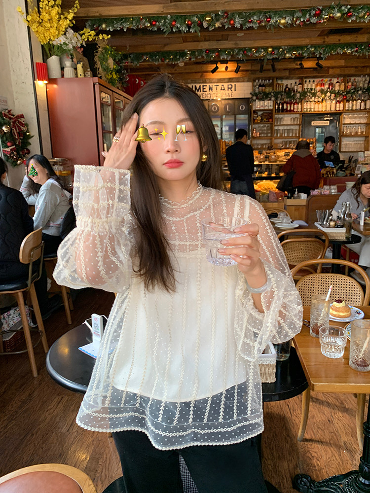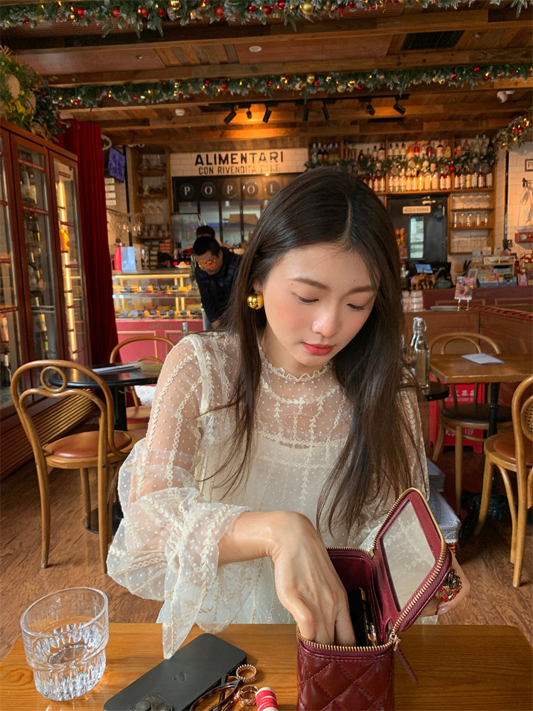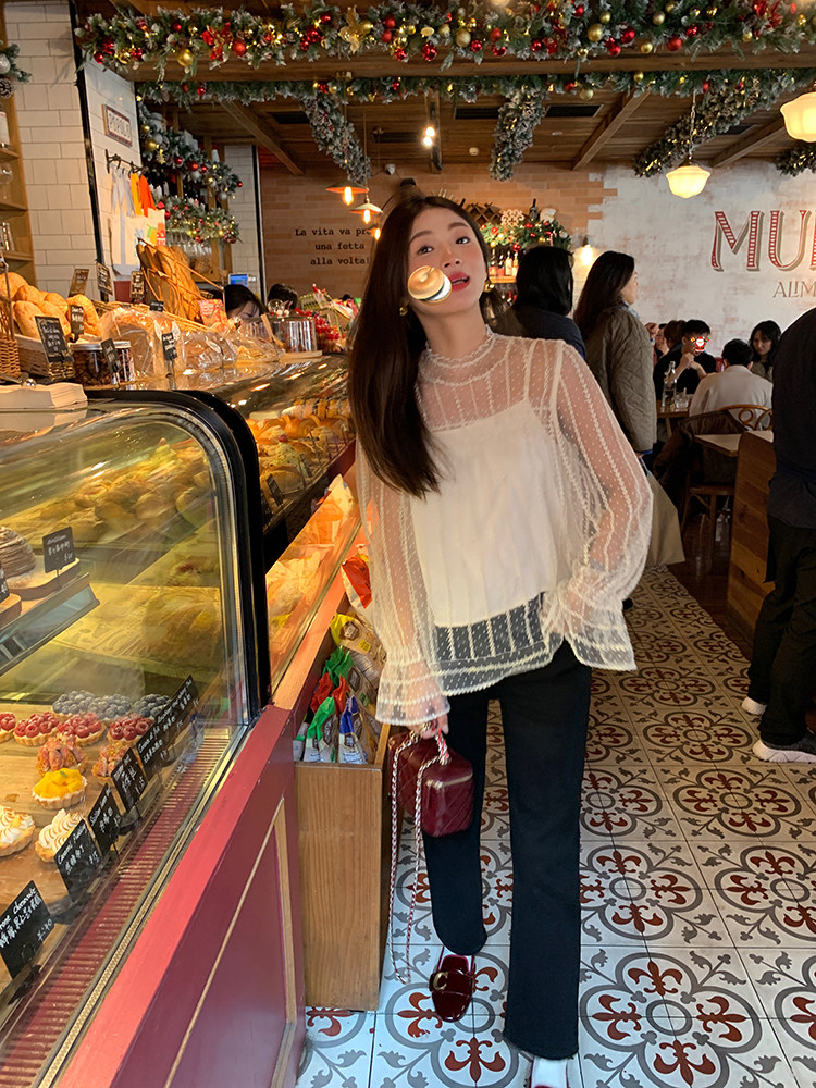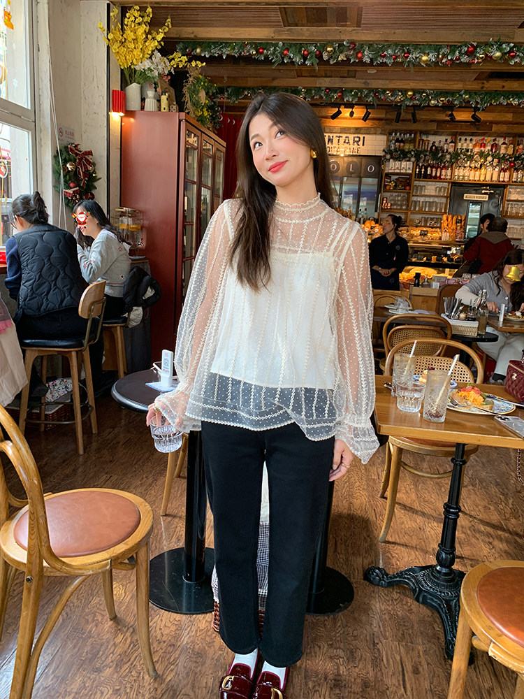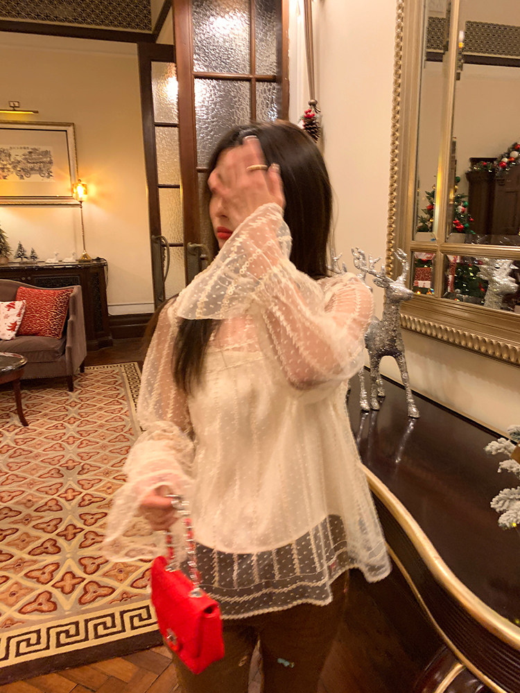 外層的襯衫采用的是網紗刺繡蕾絲面料,比較密實!