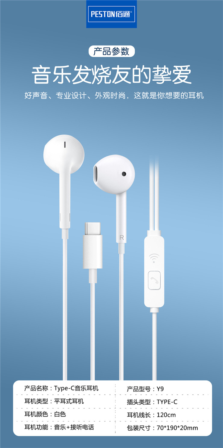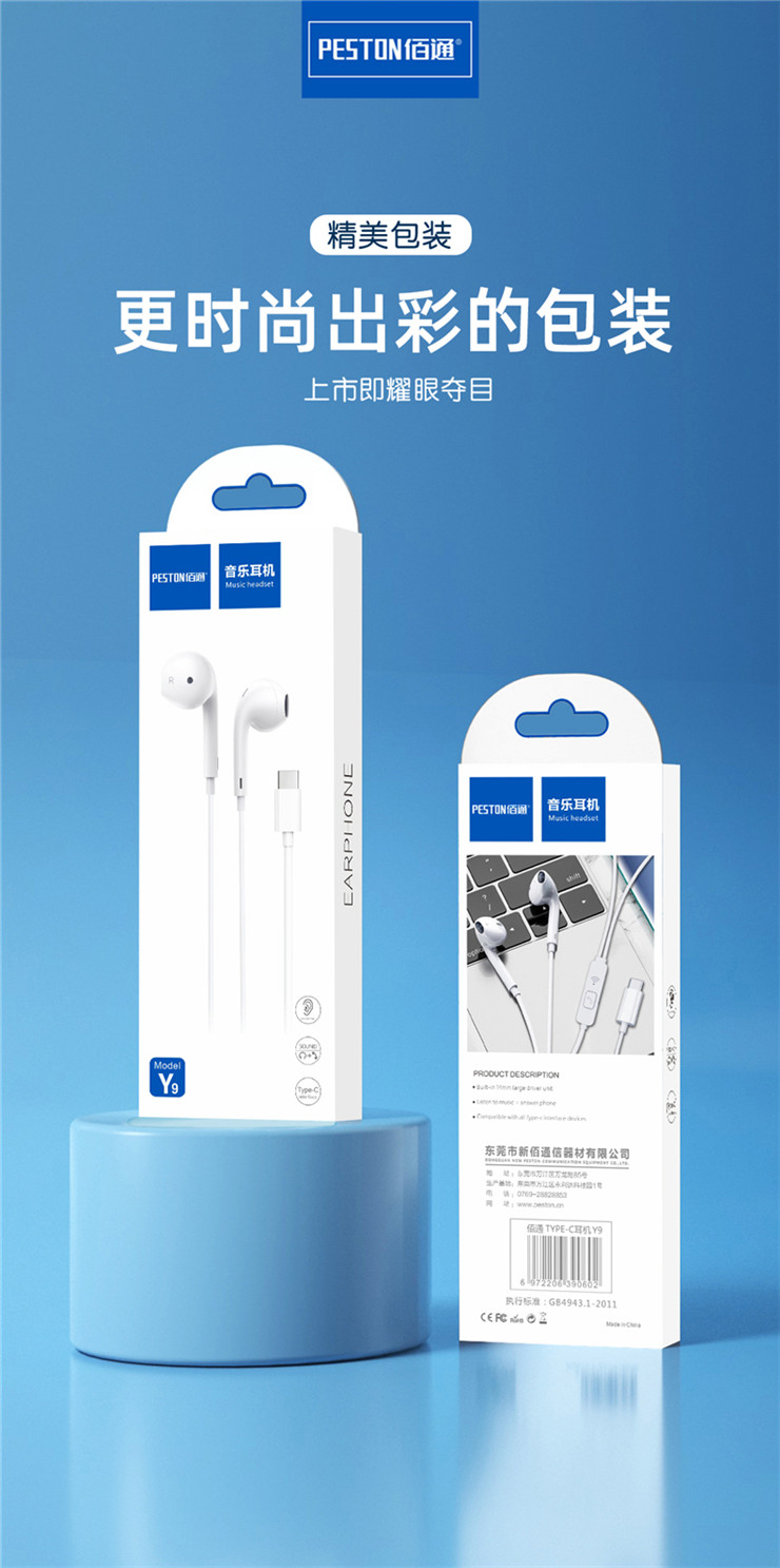 產品名稱:佰通Y9立體聲Type-C耳機 喇叭外徑:10mm 靈敏度:105dB±5dB 喇叭阻抗:32Ω 響應范圍:20-12000hz 信噪比:60dB±3dB 接頭:Type-C 線長:約120cm 包裝:精美盒裝 產品特點:Type-C接口,高保真驅動喇叭單元,音質不失真,還原聲音細節,音質飽滿有力,入耳設計,佩戴貼耳舒適不痛,內置降噪麥克風,支持高清通話,線控調節,金屬腔體,美觀大氣,支持更多設備使用。 注:因設備不同,耳機線控功能也許會有所差異,非產品問題,請知悉。 廠家直銷,承接天貓、速賣通OEM/ODM加工訂單 ![]() |