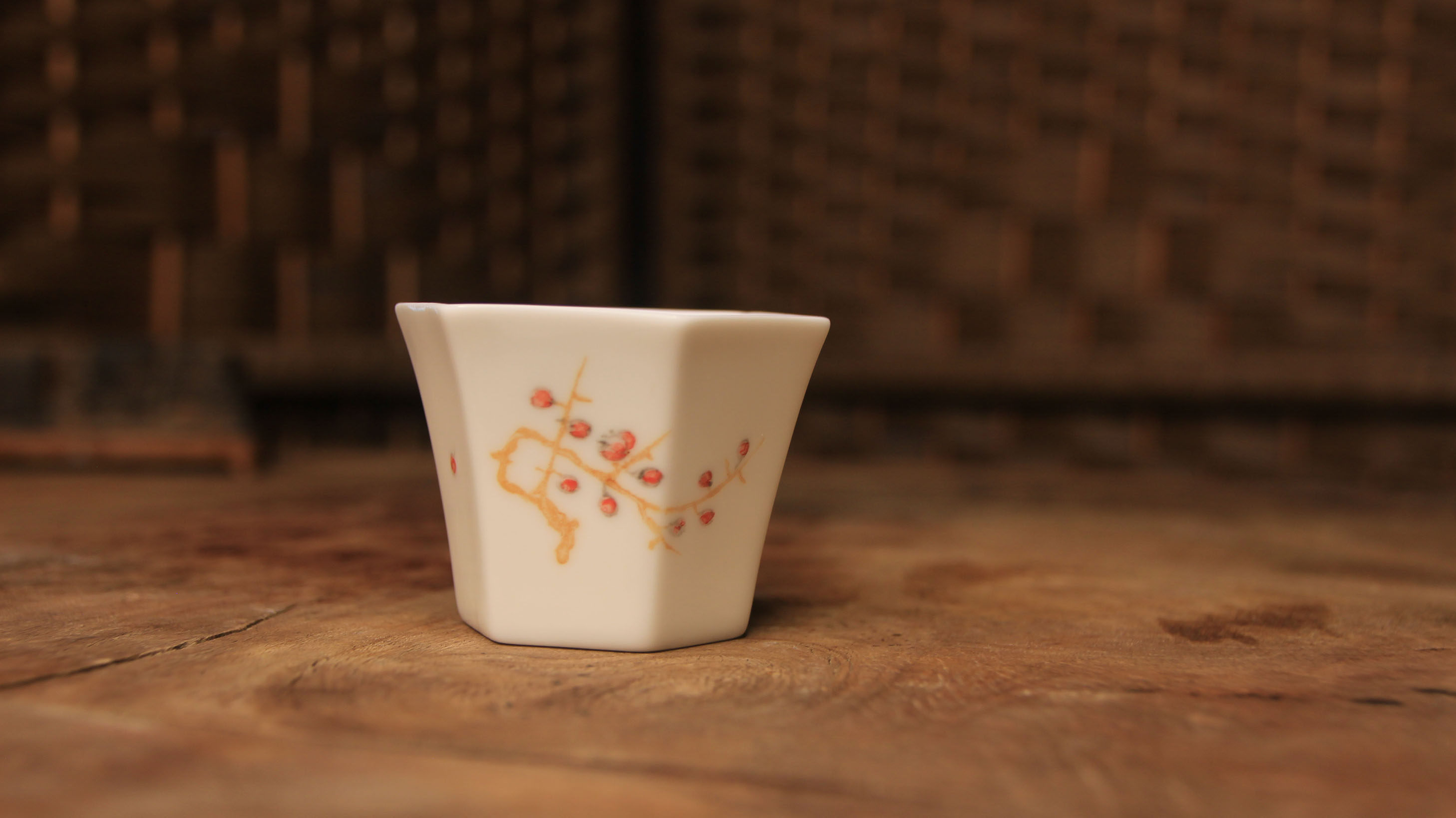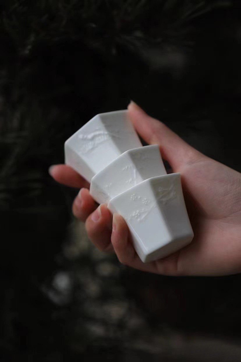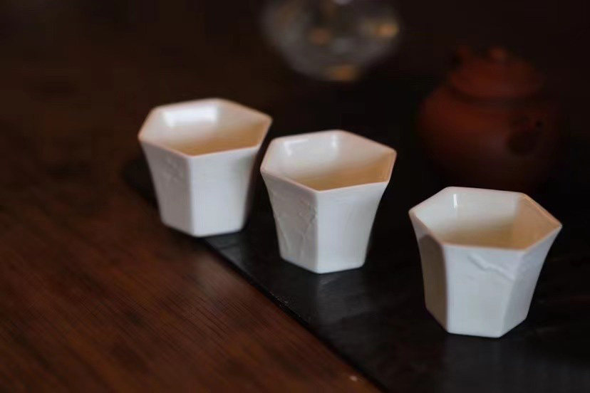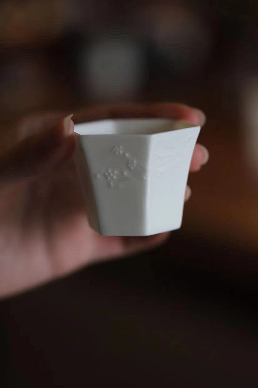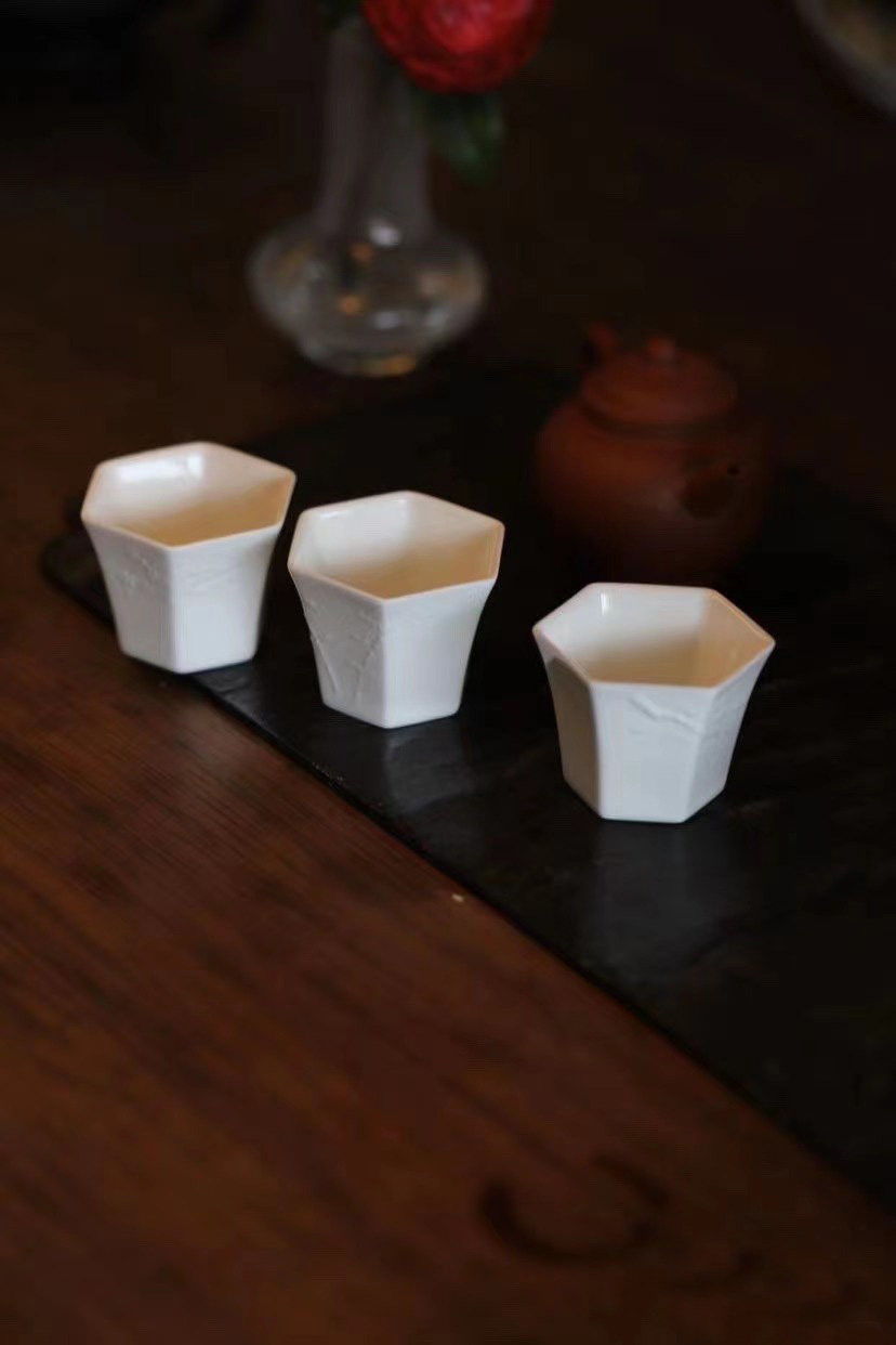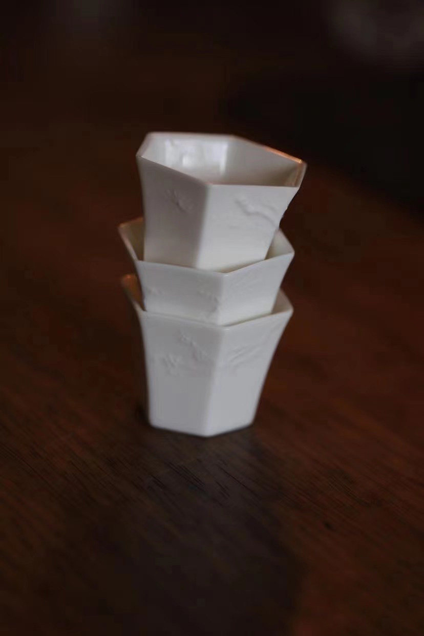 經典六方白瓷杯,刻花歲寒三友品茗杯!