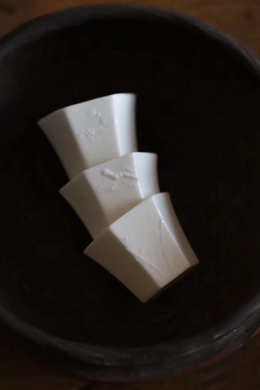 90年代臺定德化白瓷六方杯 刻花浮雕