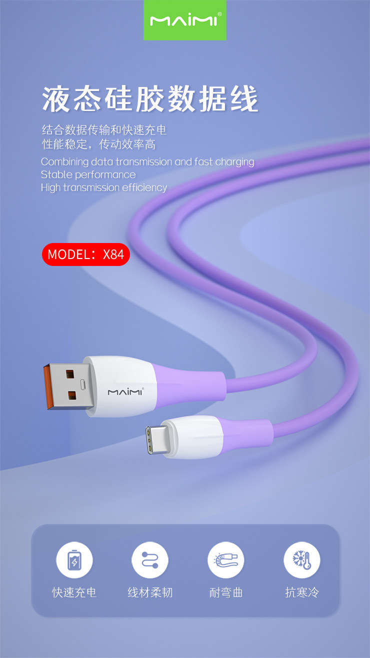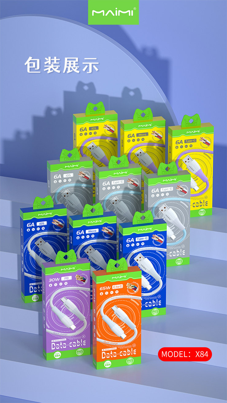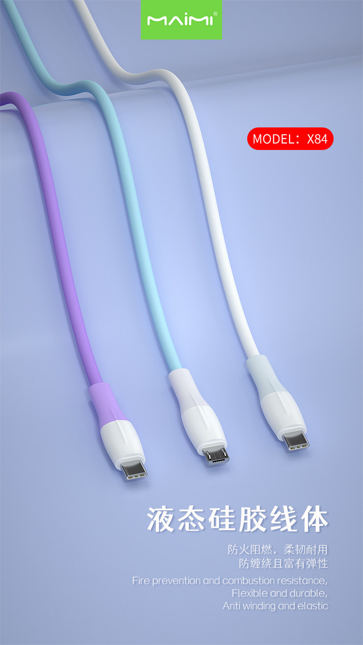 品牌:maimi/ 麥靡 名稱:麥靡X84硅膠數據線 插頭:鋁合金接口 包裝:盒裝 數據線長:約100cm 產品特點:線身用的耐低溫柔軟硅膠制作,高于普通數據線的2倍,多種不同接口可選,覆蓋了主流機型接口使用,兼容65W大電流快充,充電更快更省時,耐拉扯不易斷,耐氧化,無異味,耐用更持久。 廠家直銷,承接天貓、速賣通OEM/ODM加工訂單 |