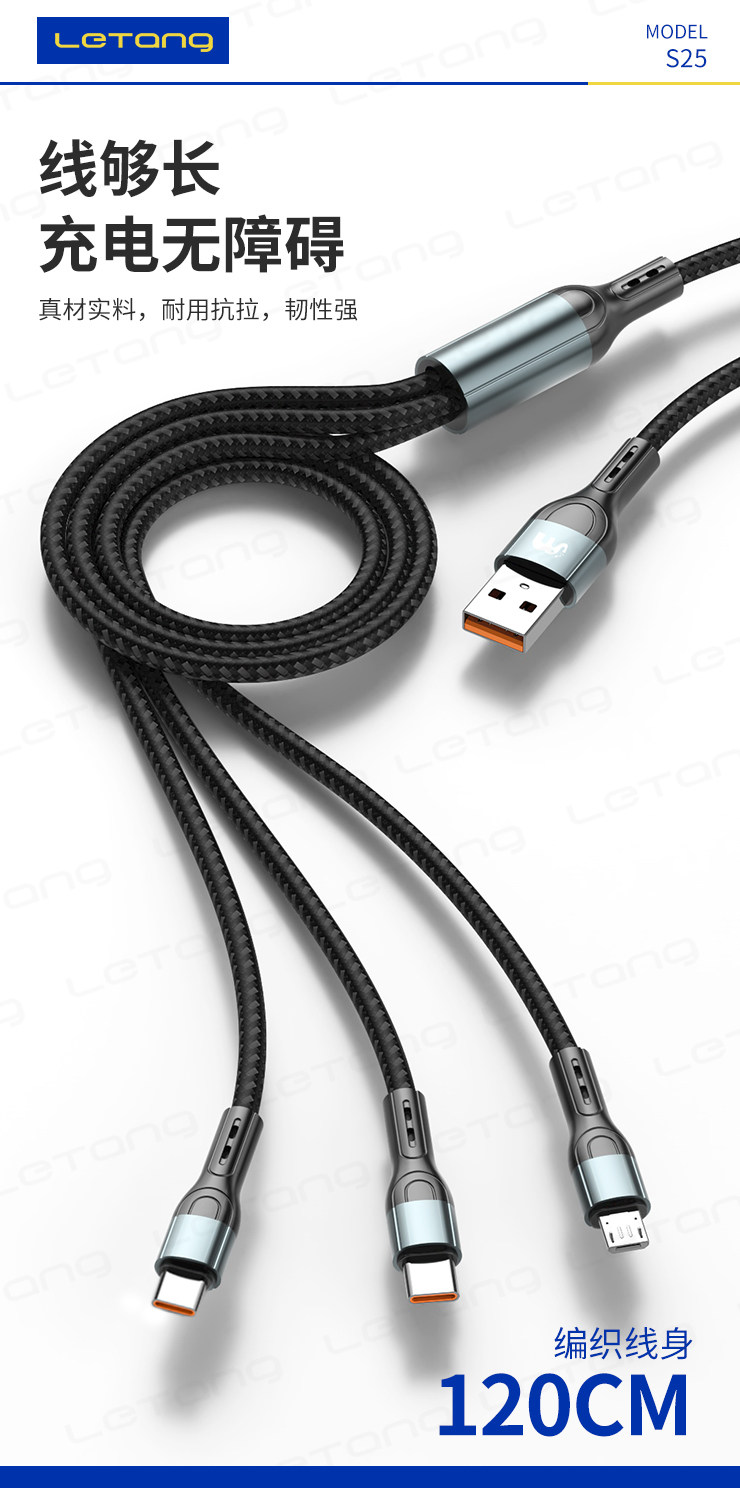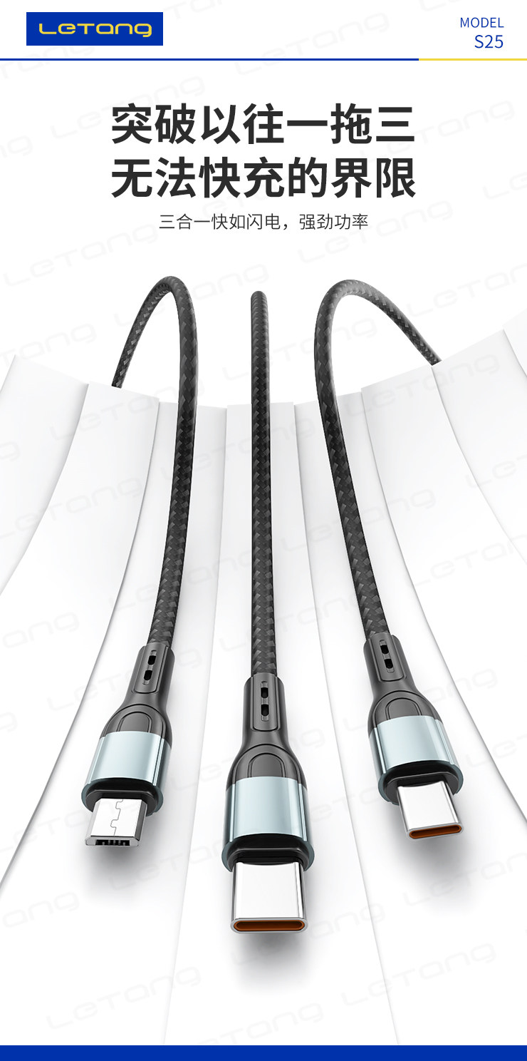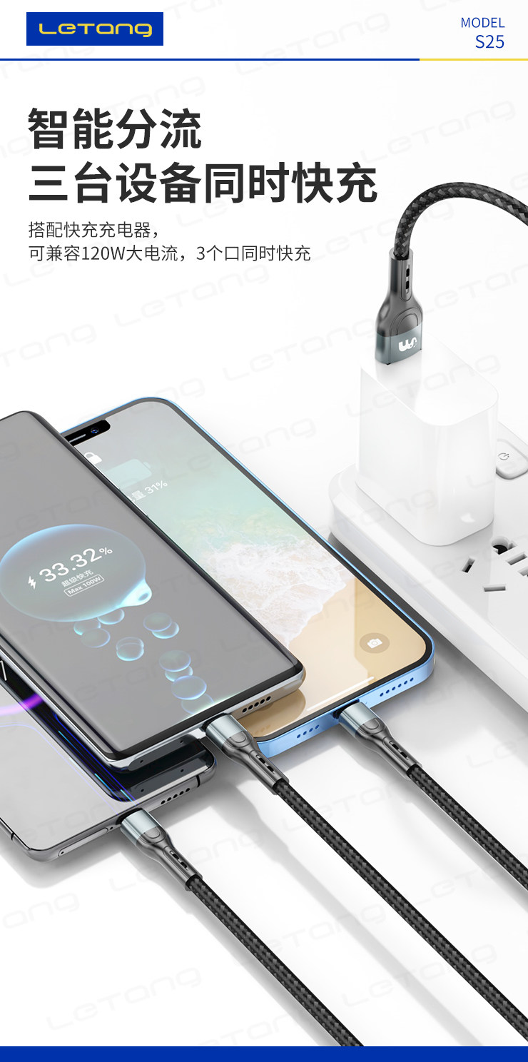 品牌:LETANG樂糖 名稱:樂糖LT-S25快充120W一拖三充電線 功能:高速充電 產品長度:總長約120cm 承載電流:6A 包裝:盒裝 產品特點:便捷一拖三設計,支持三種不同設備同時充電,支持6A快充,大功率支持120W超級快充,Type-C支持數據傳輸,防斷設計,加倍耐彎折,不怕拉扯,強韌線材,耐用耐拉扯,壽命持久,更耐用。 廠家直銷,承接天貓、速賣通OEM/ODM加工訂單 ![]() |