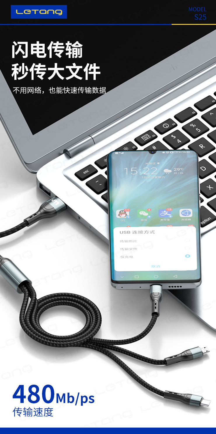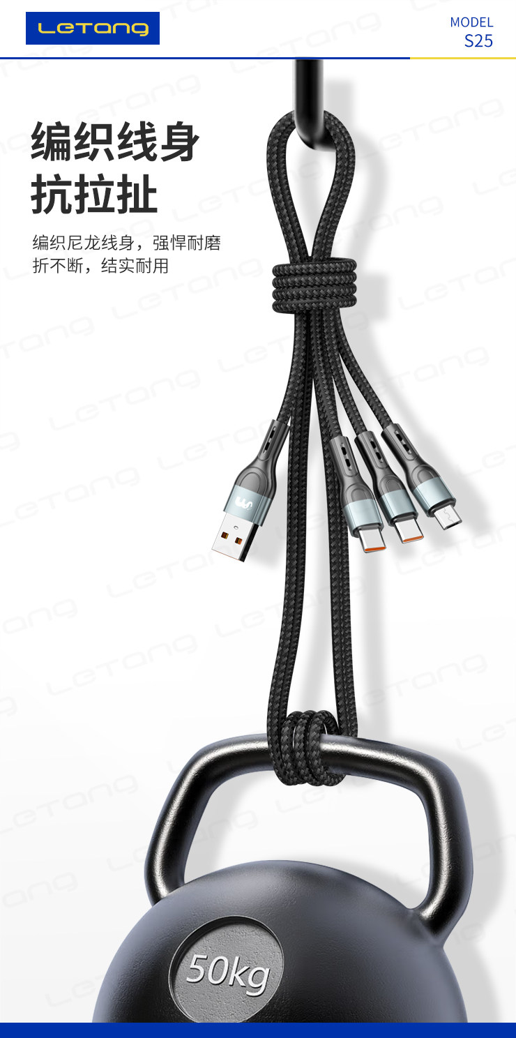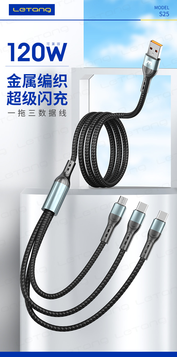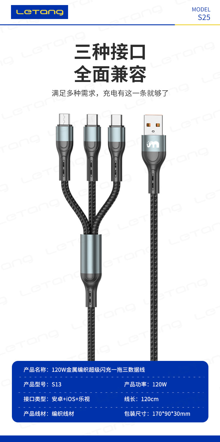 品牌:LETANG樂糖 名稱:樂糖LT-S25快充120W一拖三充電線 功能:高速充電 產品長度:總長約120cm 承載電流:6A 包裝:盒裝 產品特點:便捷一拖三設計,支持三種不同設備同時充電,支持6A快充,大功率支持120W超級快充,Type-C支持數據傳輸,防斷設計,加倍耐彎折,不怕拉扯,強韌線材,耐用耐拉扯,壽命持久,更耐用。 廠家直銷,承接天貓、速賣通OEM/ODM加工訂單 ![]() |