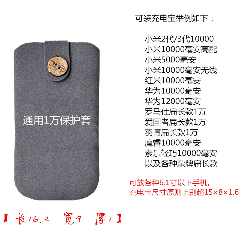 通用一萬套適用例如:小米3代1萬快充(尺寸148*74*15mm)、小米1萬高配(128*75*13mm)、華為1萬毫安CP11QMQ型號(150*70*14mm)、華為1萬APO9Q型號(138*71*16mm)、羅馬仕1萬PWG10型號(147*71*16mm)、羅馬仕1萬Sense4型號系列(138*62*22)、品勝1萬毫安TS-D286型號(142*68*16mm)、羽博1萬P1000L(145*73*14mm)、羽博5000 P5000型號(120*64*12mm)等。