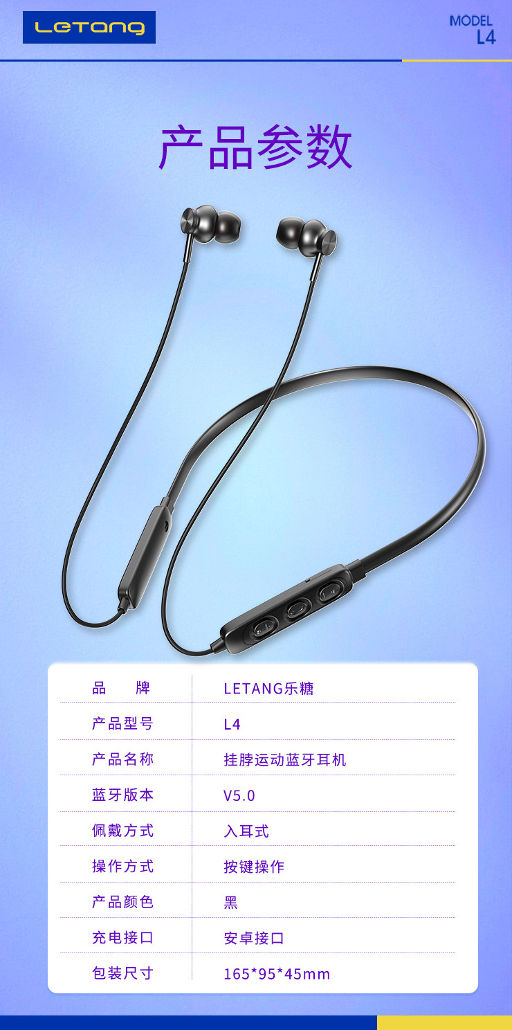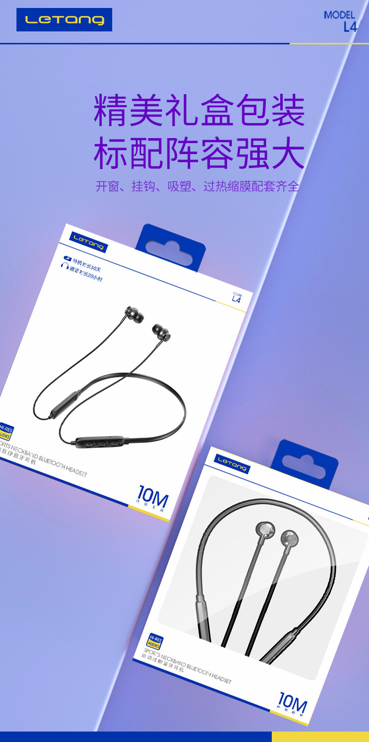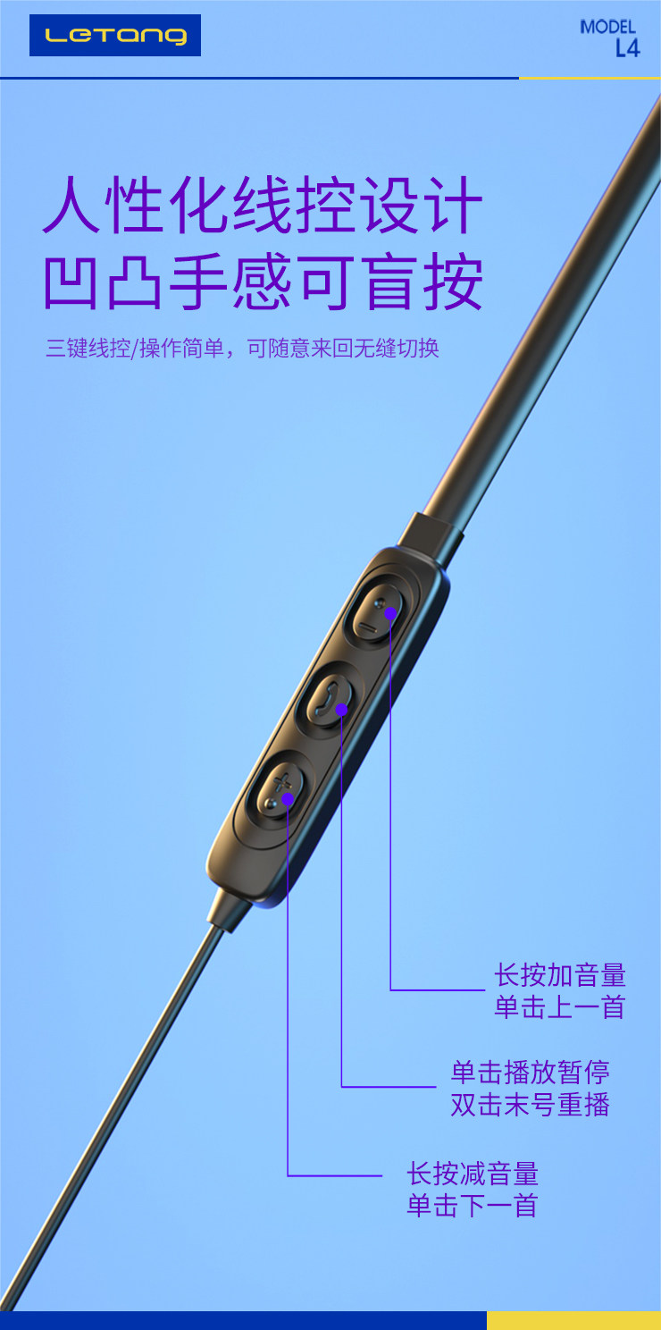 產品名稱:樂糖L4掛脖運動藍牙耳機 產品品牌:樂糖 發聲單元:定制銅環喇叭 靈敏度:101±5dB 喇叭阻抗:16Ω 響應范圍:20-1000hz 包裝:盒裝 產品特點:藍牙快速連接,體驗升級,定制真銅環高清驅動單元,音質不失真,仿生振膜,專業調音,還原聲音細節,環繞金屬腔體,音質飽滿有力,左右聲道分明,入耳設計,佩戴貼耳舒適不痛,內置降噪麥克風,支持高清通話。 廠家直銷,承接天貓、速賣通OEM/ODM加工訂單 ![]() |