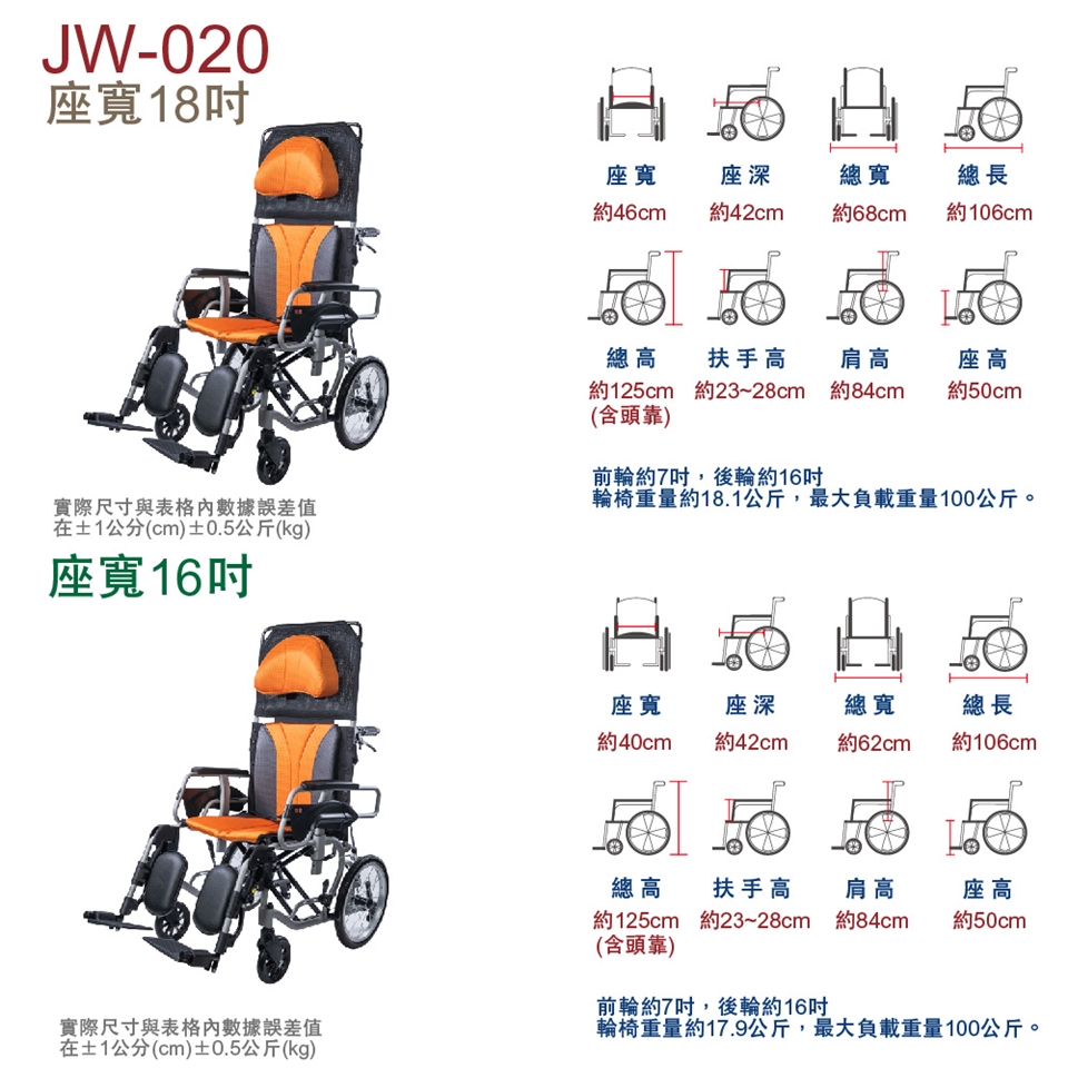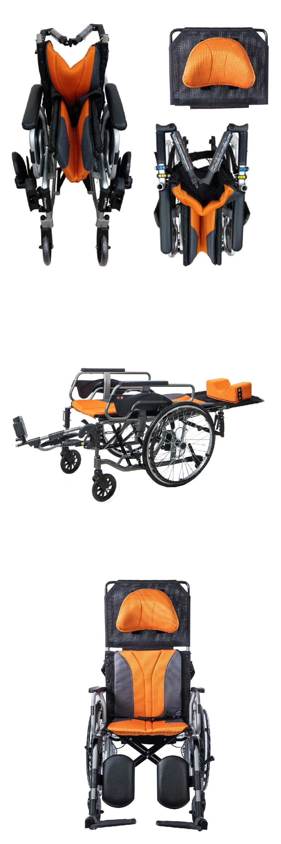 1. 全拆升降扶手、骨科腳坐臥兩用型輪椅。