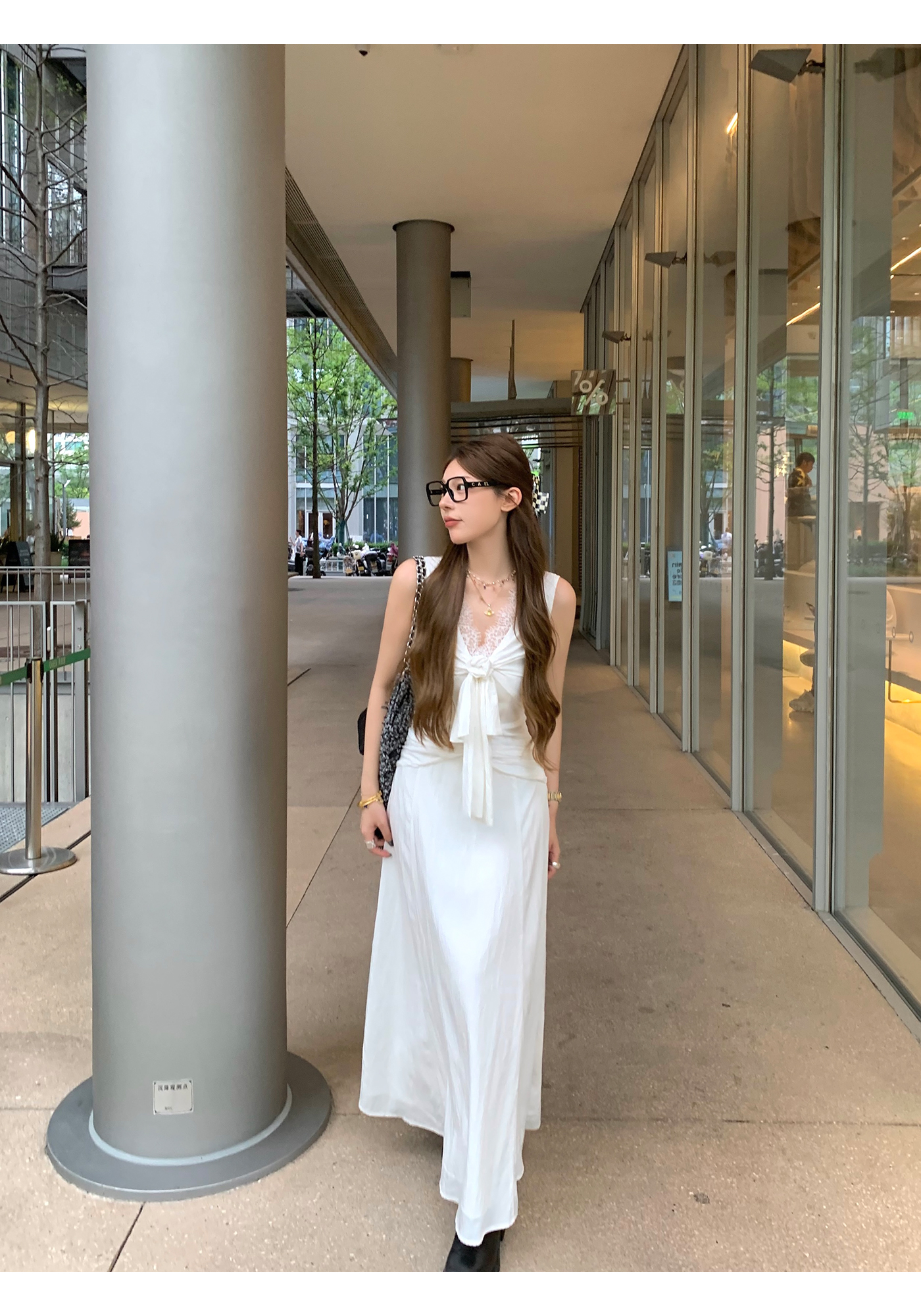 V領法式小眾設計白色無袖長款連衣裙