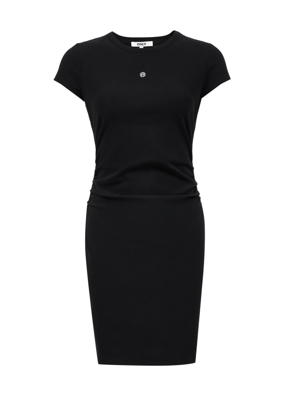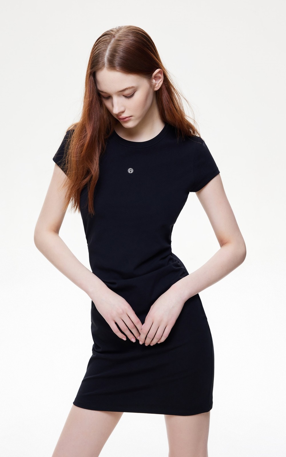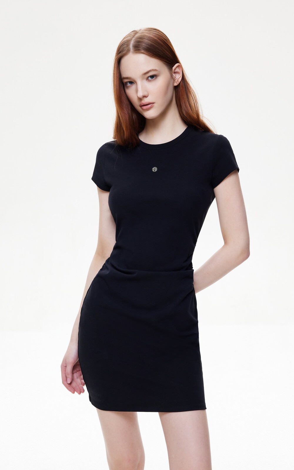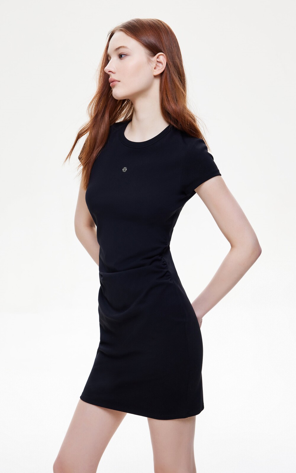 短袖修身連衣裙,腰部兩側捏褶的設計