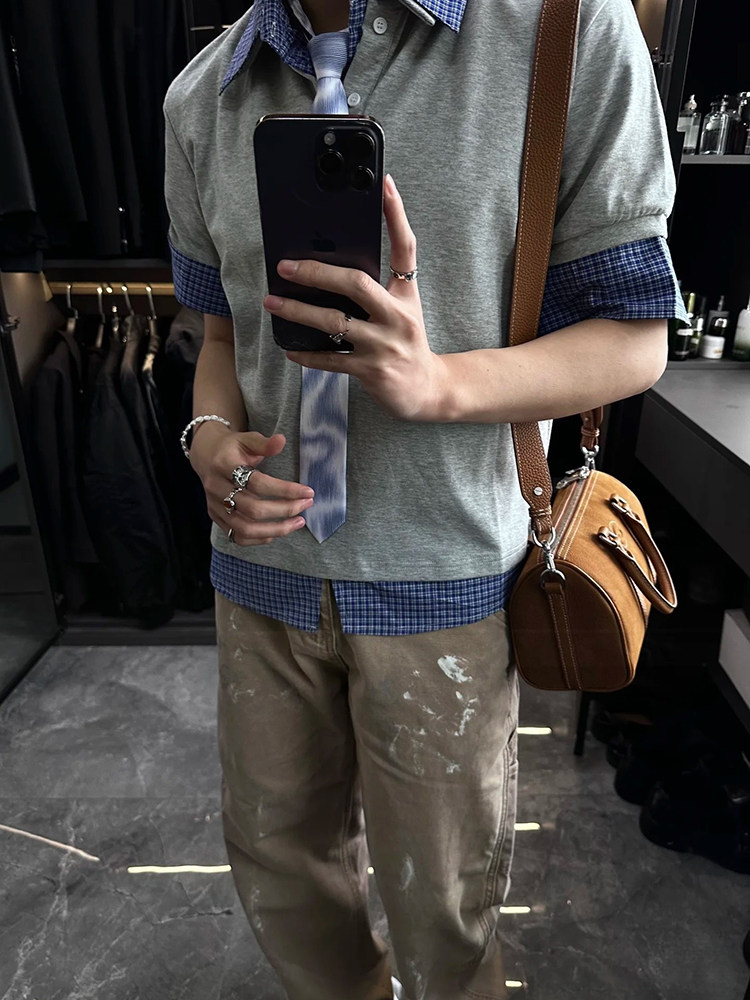 !!復古學院風假兩件polo 袖口領口拼接格紋襯衫 做的是真領真袖口定針拼接 做到了真正的層次感!!