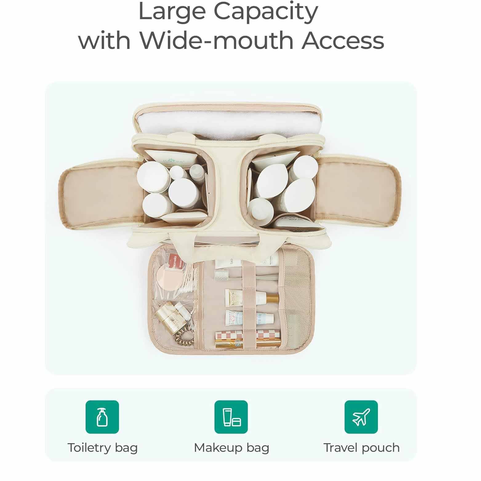 寬敞的空間:尺寸 - 11.8''L x 7.3''W x 8.3'H。帶有 4 個隔層的旅行洗漱包。前袋包括兩個大網袋、一個用于存放化妝刷的彈性繩袋和一個用于存放小物品的透明底袋。