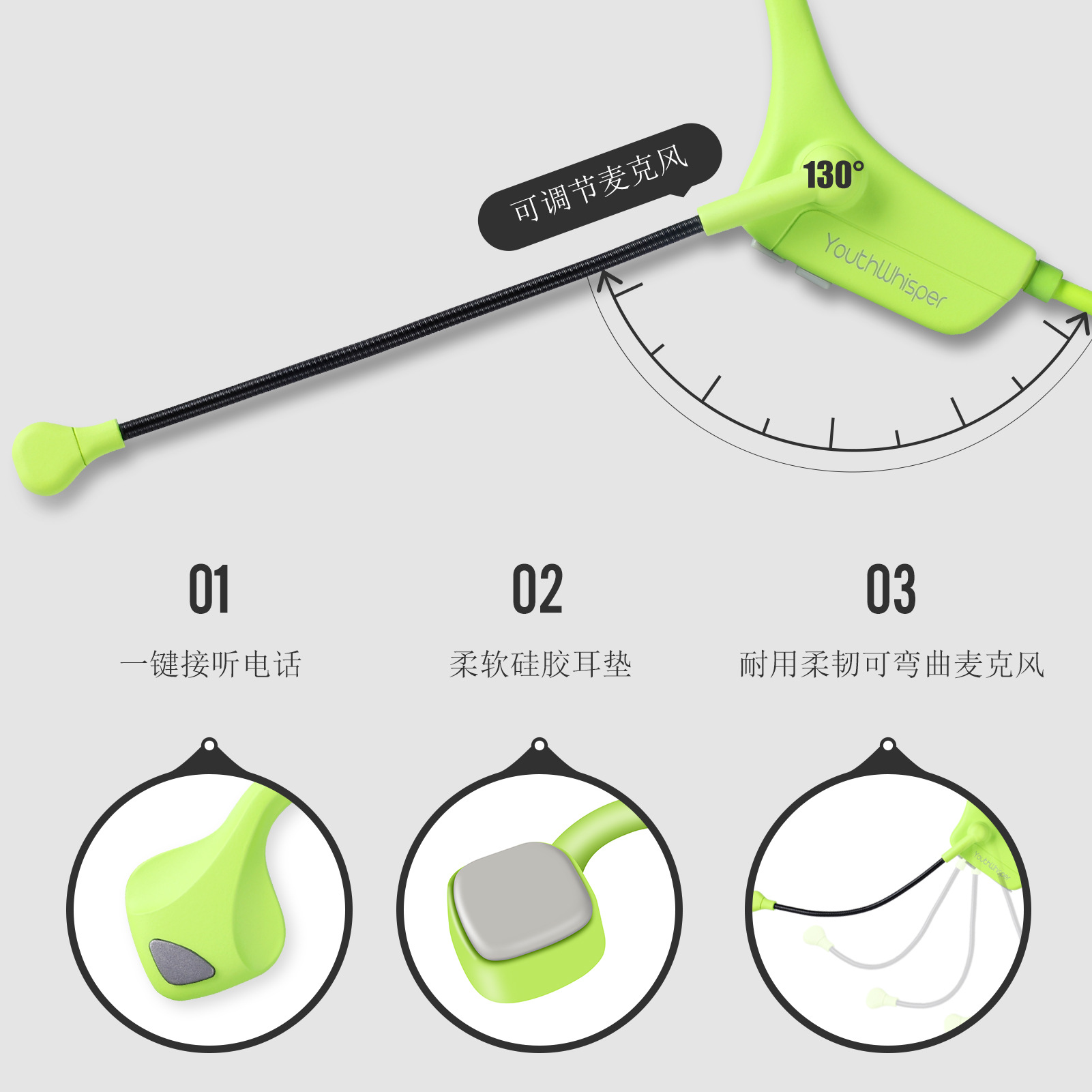 這款帶麥克風的骨傳導耳機配有 130° 可調節 DSP 降噪吊桿麥克風,當麥克風靠近嘴部時,它能清晰地接收到您的聲音,還能消除背景噪音,確保即使在嘈雜的環境中也能清晰通話。