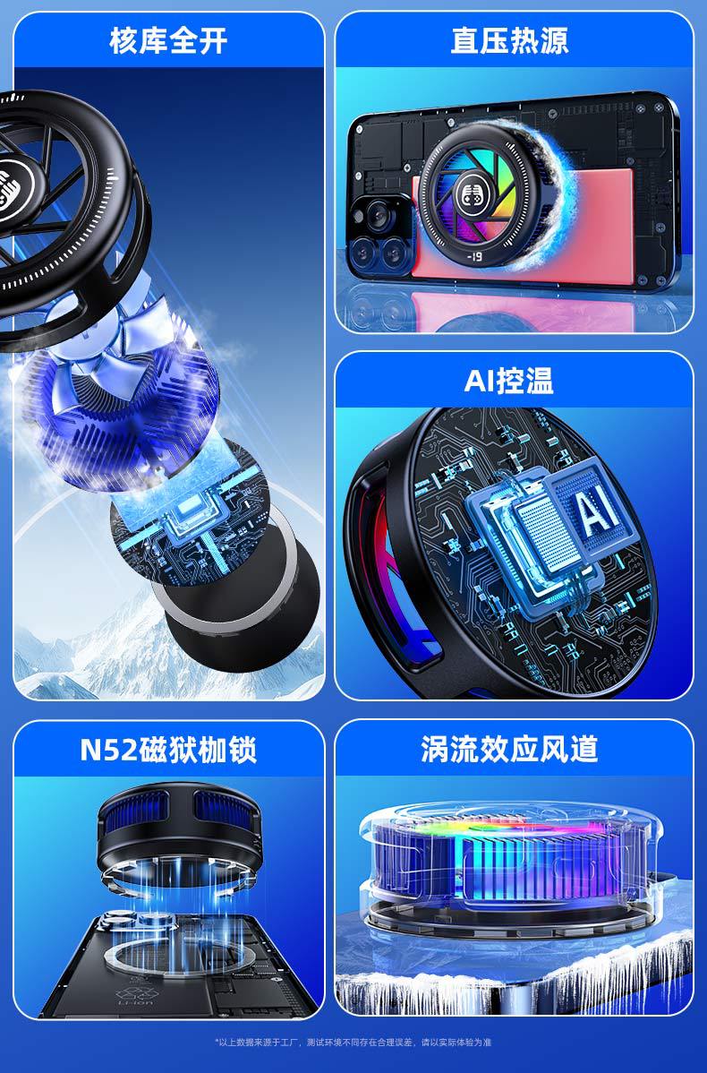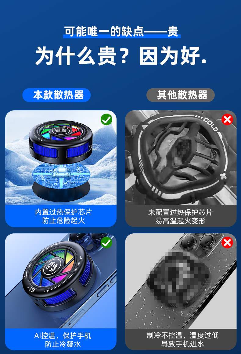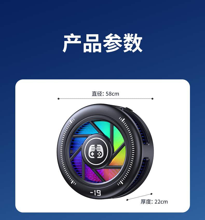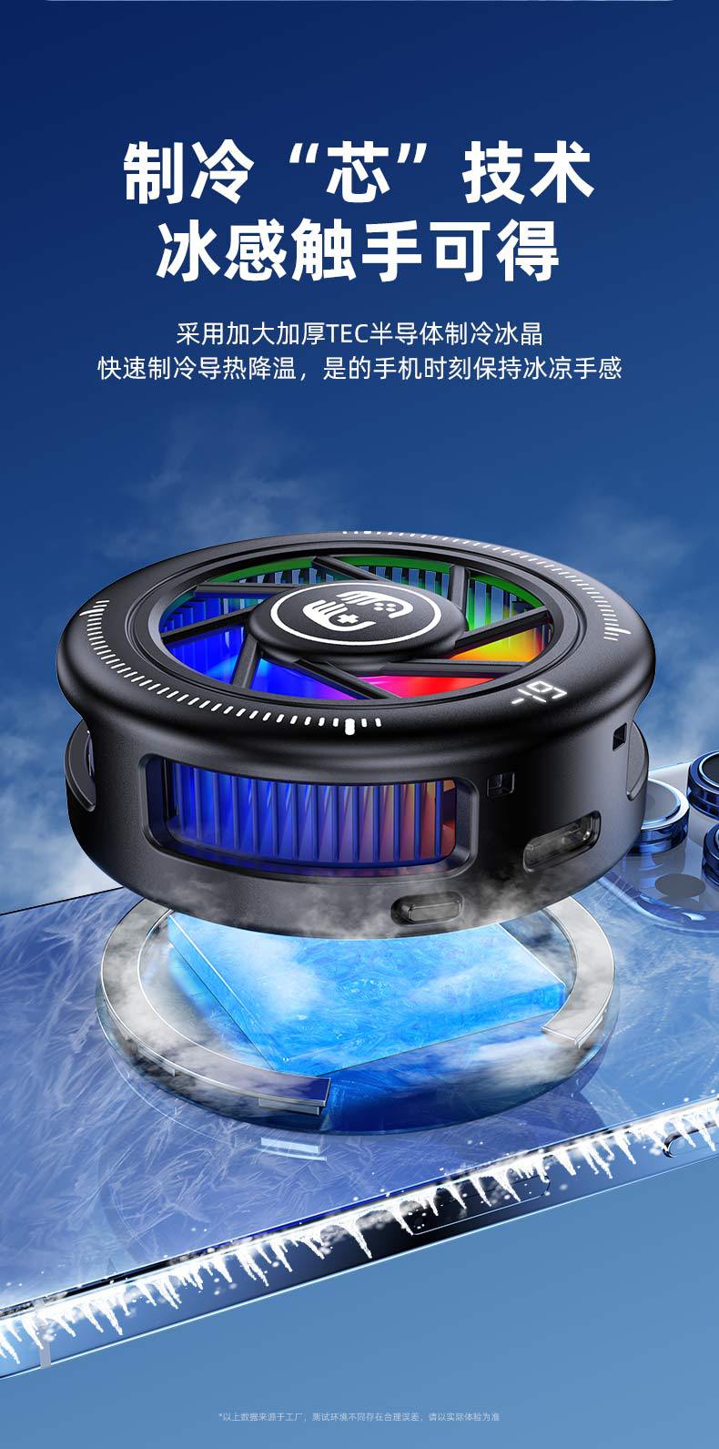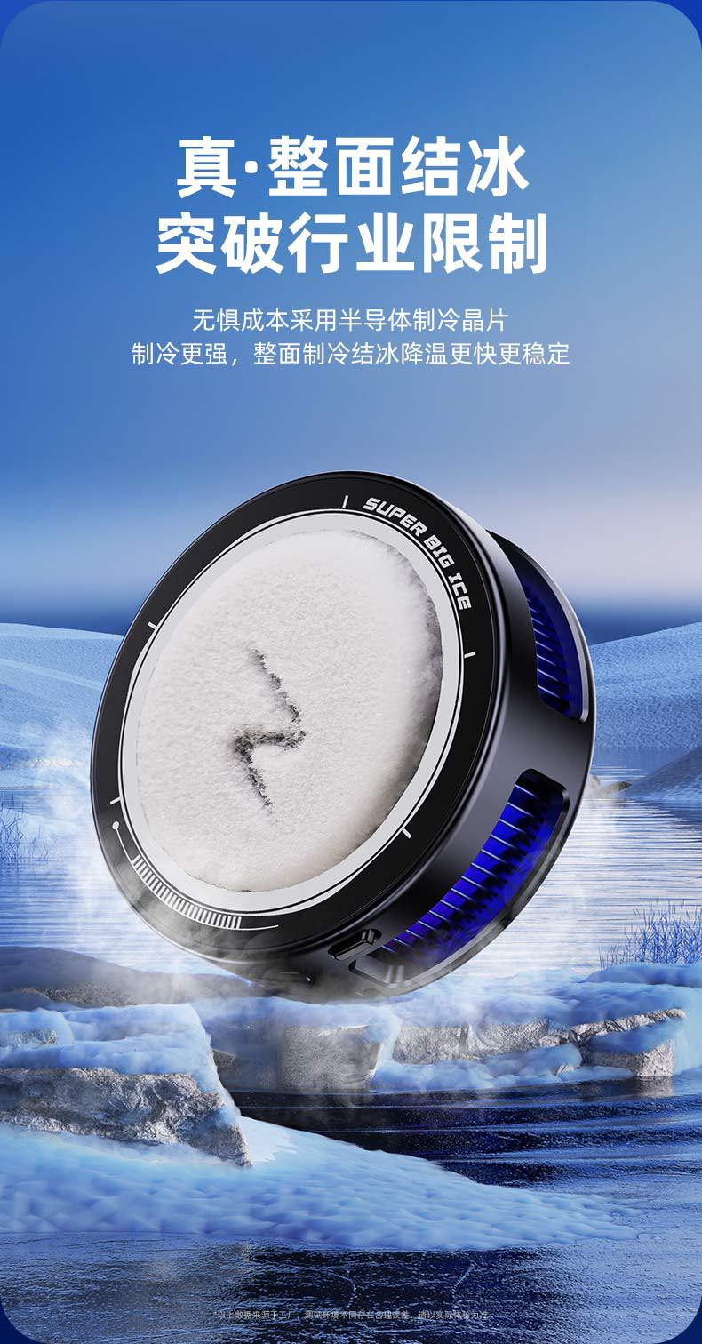 產品賣點:散熱器小巧迷你,做到不擋手,15W結冰,內置渦輪風扇,RGB燈光,三檔模式切換,AI檔控制溫度,默認10°左右,帶數顯功能。另外可搭配直播支架,磁吸背夾兩用,完美搭配直播支架使用,直播好伴侶。