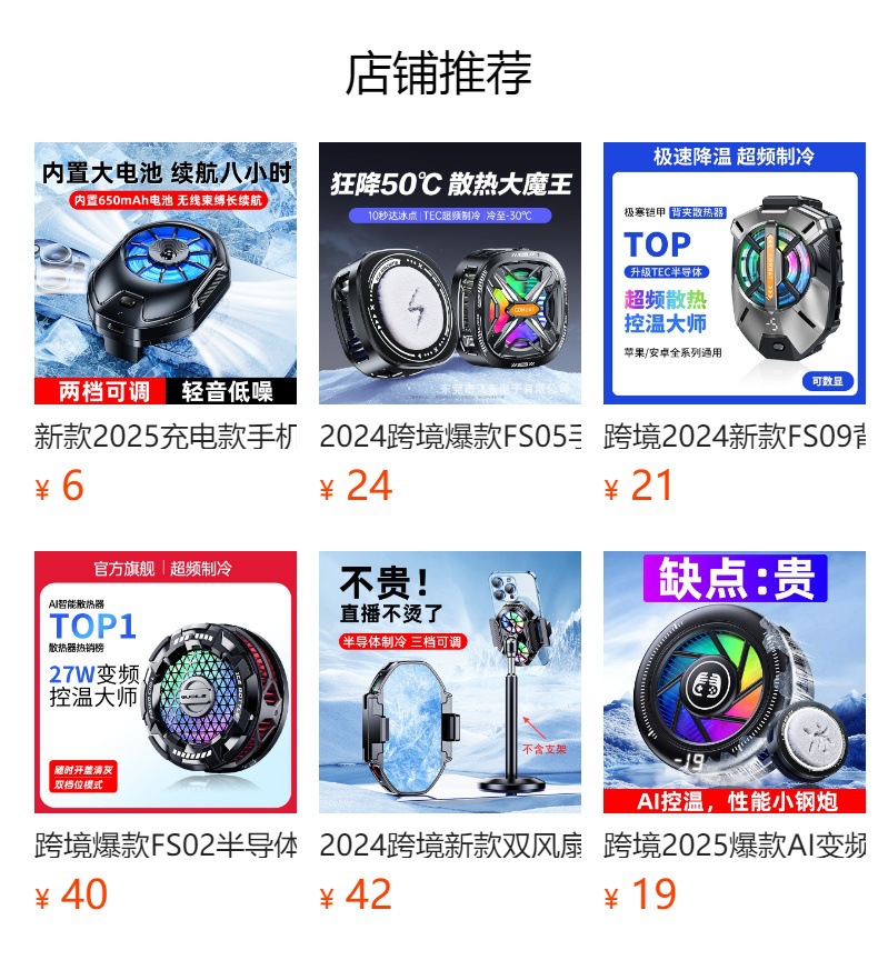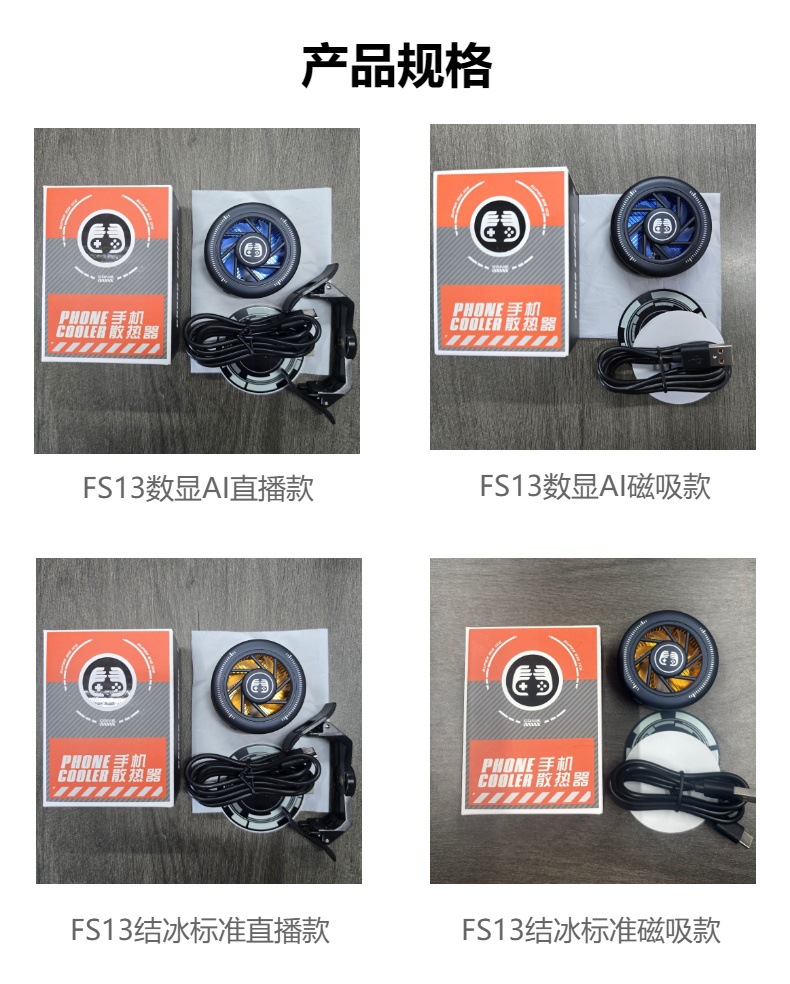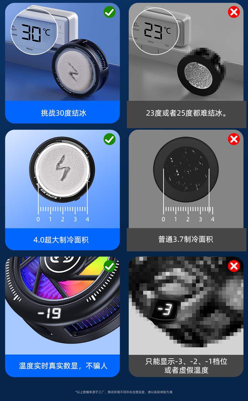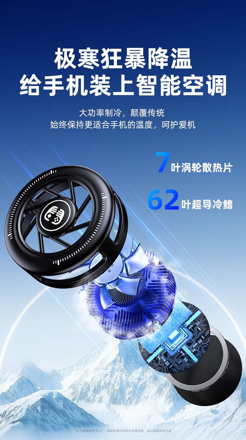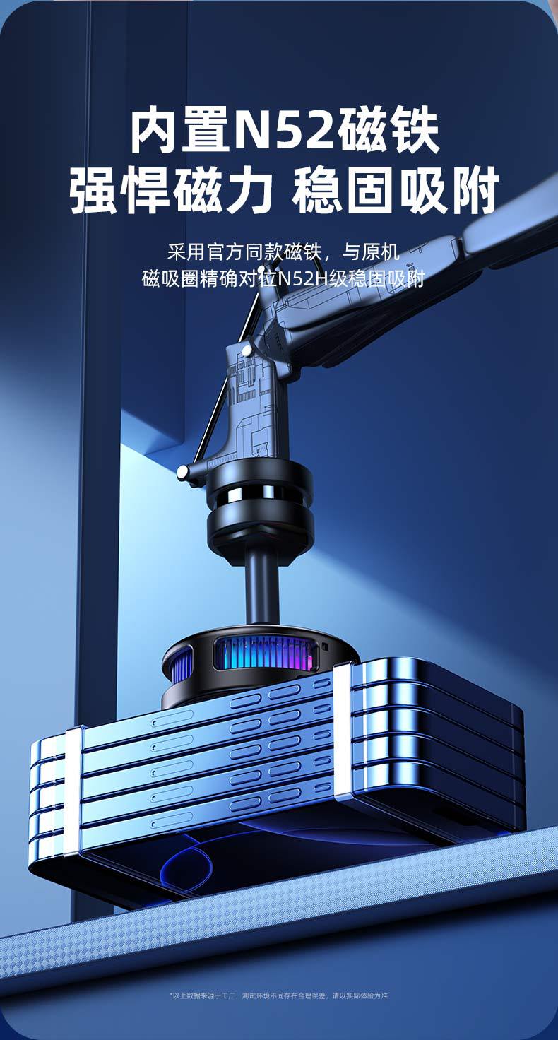 產品賣點:散熱器小巧迷你,做到不擋手,15W結冰,內置渦輪風扇,RGB燈光,三檔模式切換,AI檔控制溫度,默認10°左右,帶數顯功能。另外可搭配直播支架,磁吸背夾兩用,完美搭配直播支架使用,直播好伴侶。