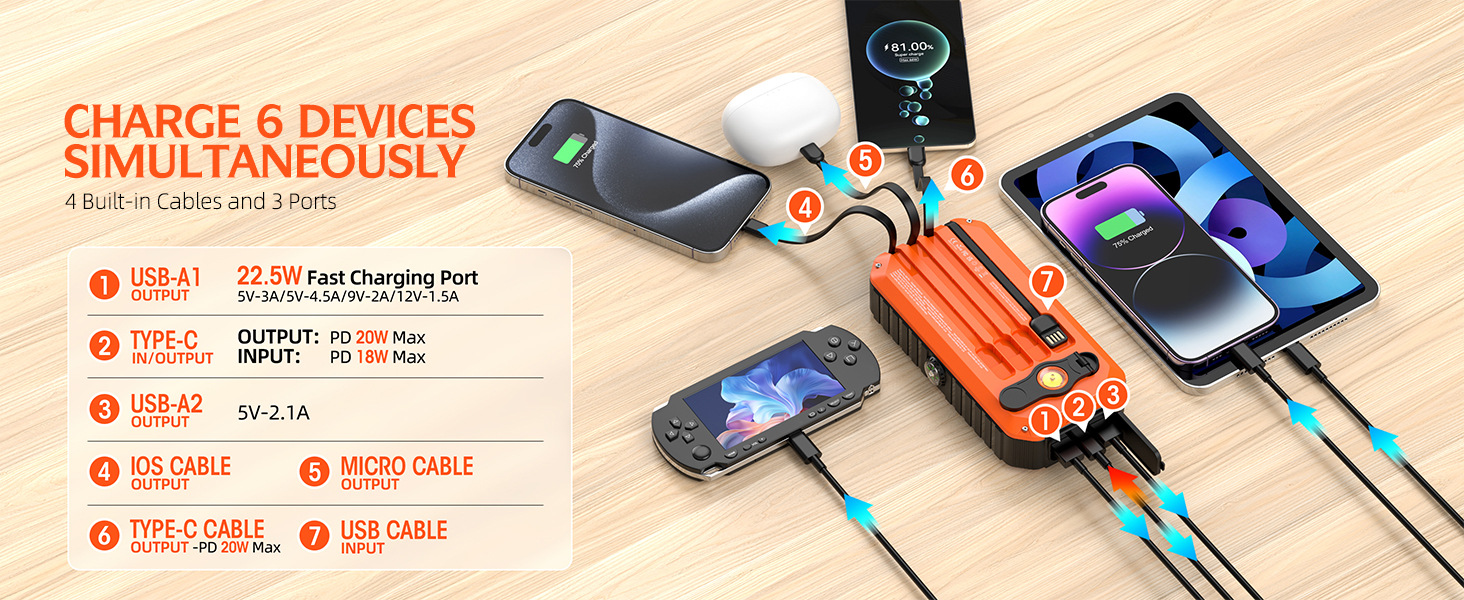 自帶線(USB-A):5V/3A;9V/2A;12V/1.5A;(QC18W Max)