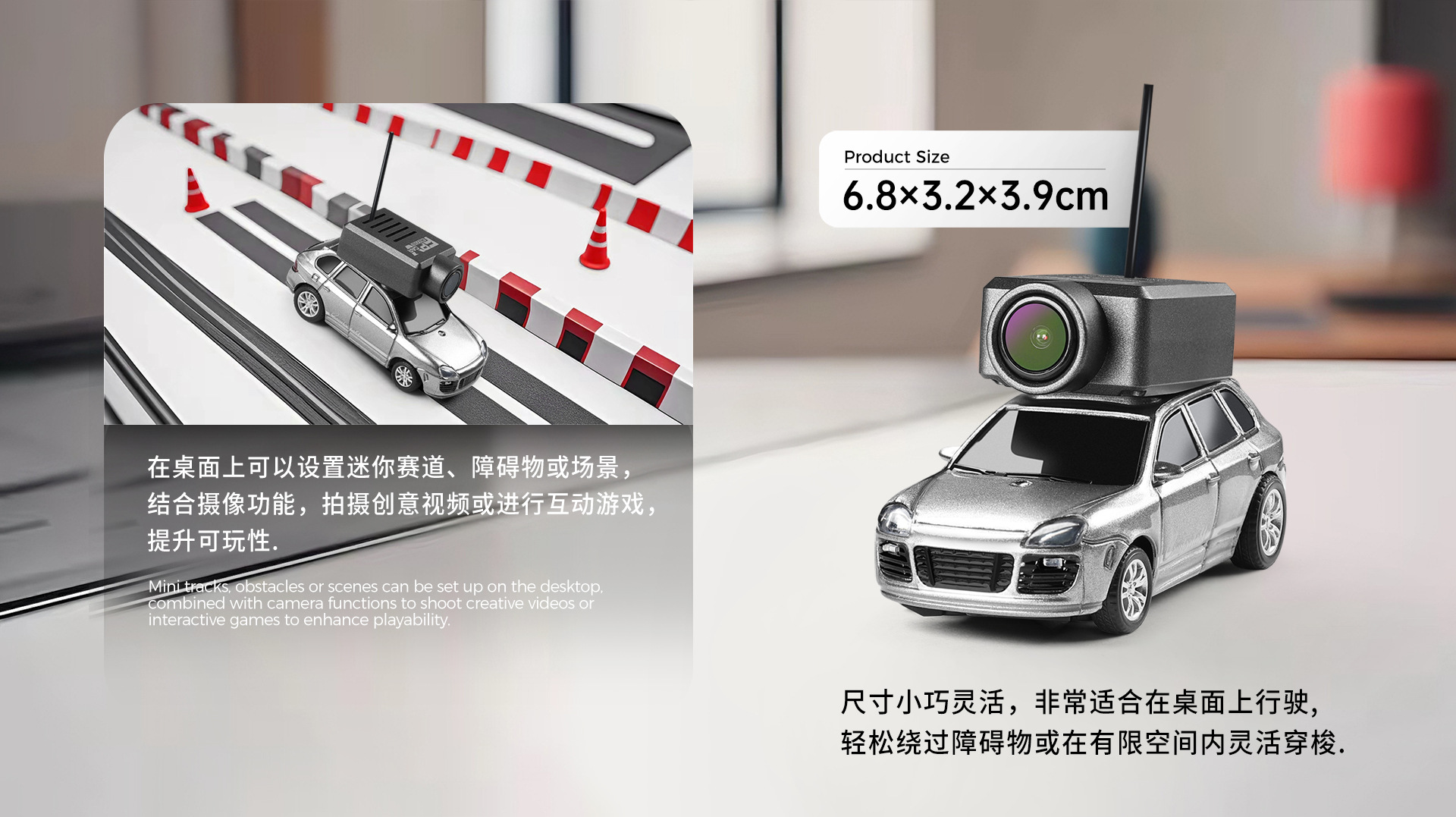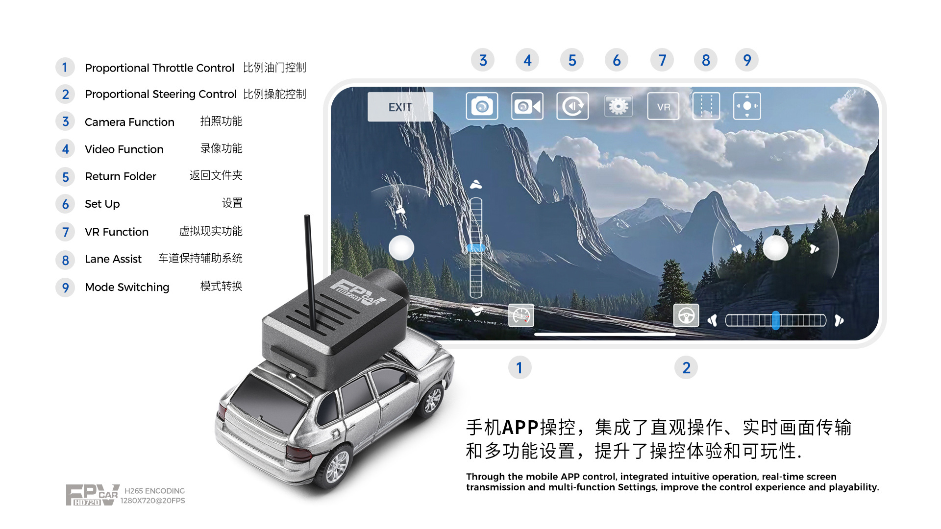 7、APP有拍照、攝像、VR、控制車前進/后退、左右轉向等功能。攝像頭像素:720P 廣角