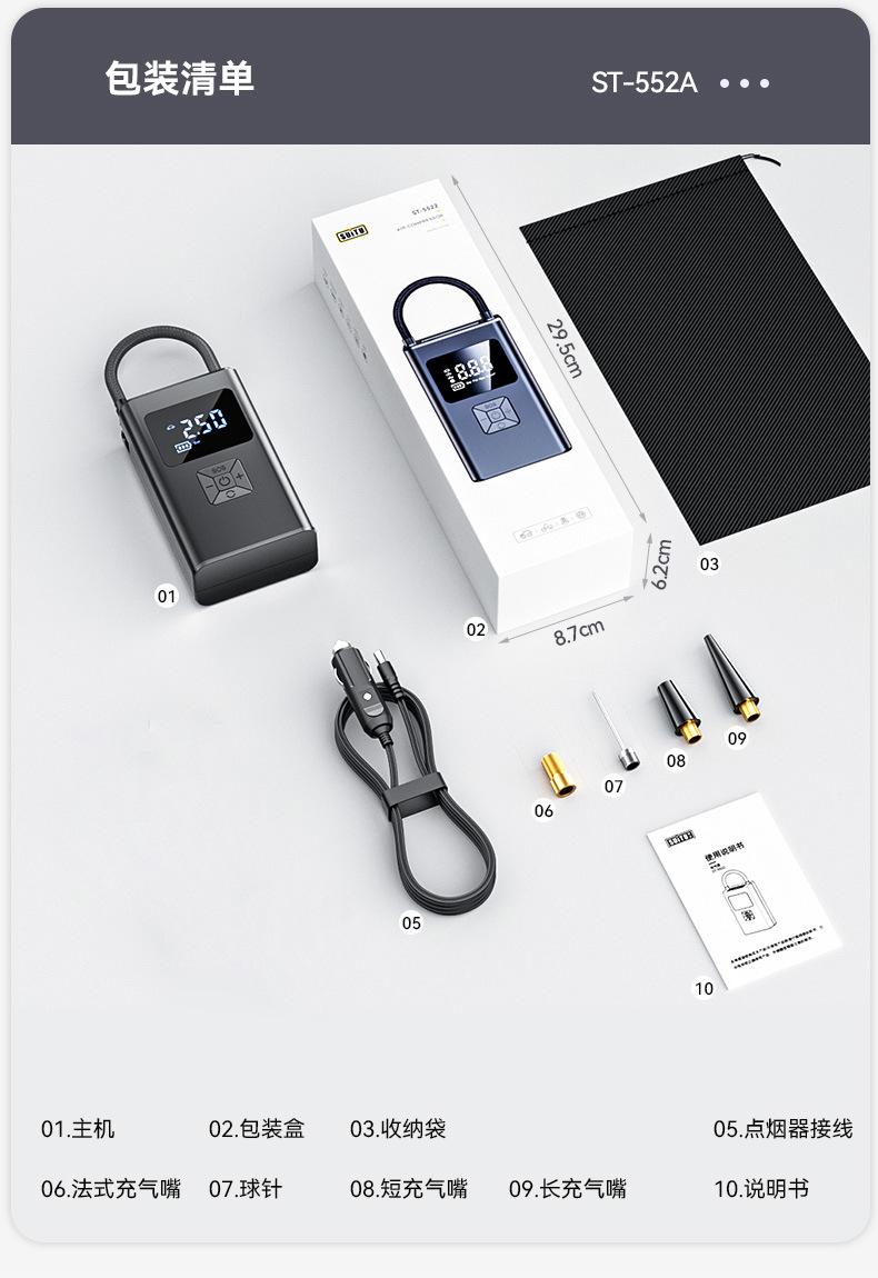 【ST-5522B 無線】主機*1,充氣軟管*1,充氣嘴4件套,Type-C充電線,3M美式12V線,說明書*1,彩盒*1