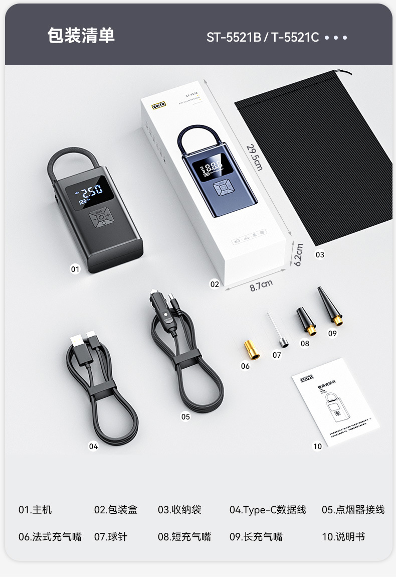 【ST-5522C 無線】主機*1,充氣軟管*1,充氣嘴4件套,Type-C充電線,3M美式12V線,說明書*1,彩盒*1