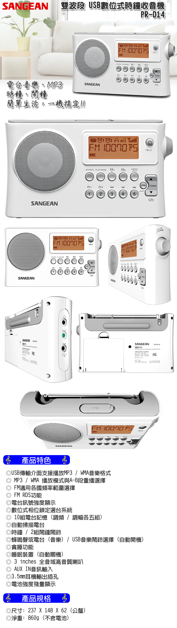 商品詳細介紹 usb傳輸介面支援播放mp3 / wma音樂格式mp3 / wma 播放模式與a-b段重播選擇fm適用各國頻率範圍選擇fm rds功能電台訊號強度顯示數位式相位鎖定選台系統10組電台記憶 (調頻 / 調幅各五組) 使用方法說明 無 注意事項 ◎請注意!!鑑賞期並非試用期,此商品不提供任何試用 ◎依照消費者保護法規定,消費者均享有產品到貨七天猶豫期之權益,但退回產品必須是全新狀態且包裝完整 ◎本產品一經拆封使用過後,除產品本身瑕疵,恕無法辦理退貨 ◎本產品文案為原廠所提供,若有變動敬請參照實際商品為準 ◎本產品網頁因拍攝關係,圖檔略有差異,實際以廠商出貨為主
