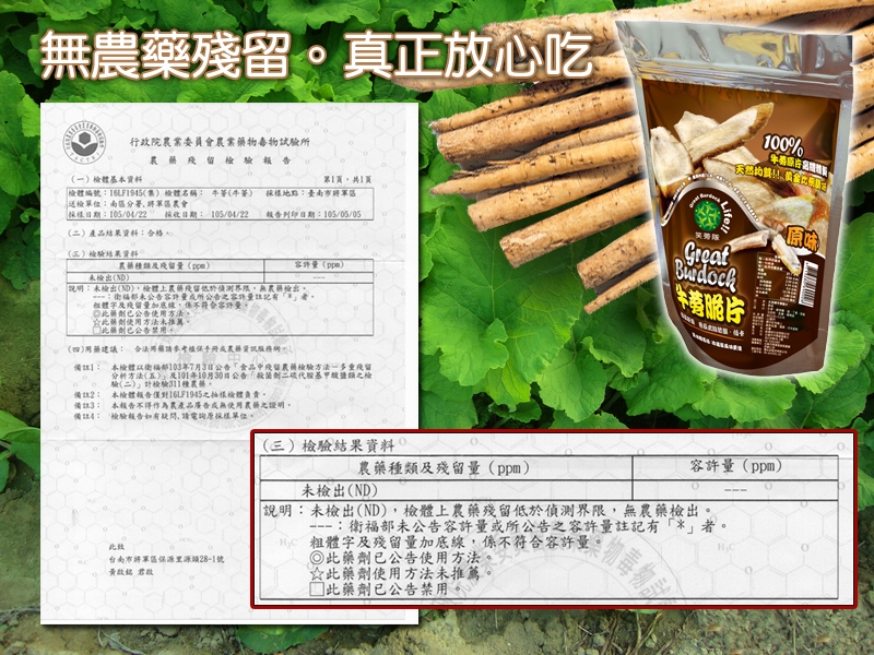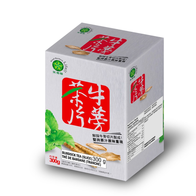 牛蒡清洗→切片2mm→獨門技術遵循日曝工藝法(即 : 以網置曝曬方式,將切片後牛蒡的使其吸收自然光度(約29~32度),將牛蒡所富含營養成分行成包覆作用,其風味獨特,且百分之百可攝取其養分)→高溫乾燥→篩濾→檢驗→包裝。