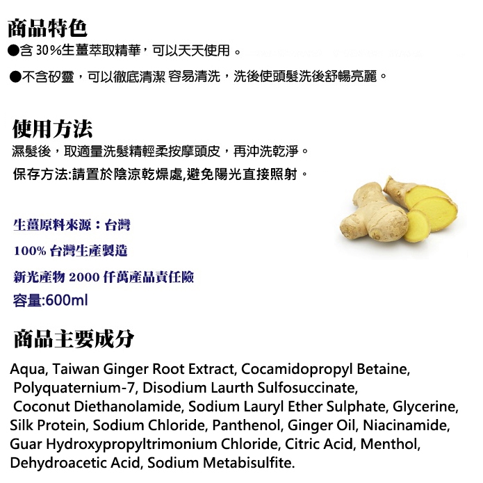 濕髮後,取適量生薑洗髮精輕柔按摩頭皮,再沖洗乾淨。