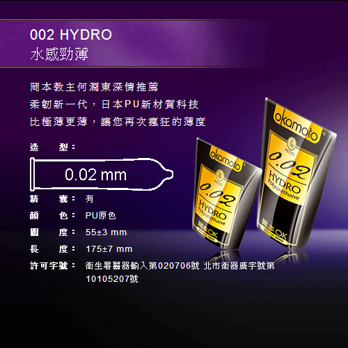 許可字號: 衛生署醫器輸入第020706號 北市衛器廣字號第10105207號 使用說明: 1.小心打開衛生套之鋁箔包裝。切勿讓衛生套被指甲、戒指等物損壞衛生套。 2.請留意翻捲部分應在外。 3.用拇指及食指握著衛生套頂端,放上已勃起之陰莖龜頭上。 4.擠出衛生套頂端之空氣。 5.用另一手將衛生套由陰莖頂部捲至末端。(由於精液在射精前也會排出,因此在未套上衛生套前無論陰莖勃起與否,也不應接觸性伴侶的身體,已防止性傳染疾病和受孕。) 6.完成性交射精後,應在陰莖仍勃起之情況下用手按著衛生套底部環抽出陰莖。(抽出時防止衛生套脫落)並避免接觸對方身體直至帶上新的衛生套。 7.除去衛生套及將之棄置。用紙巾包好衛生套,然後放入垃圾桶。切勿置於馬桶內。 8.衛生套為一次性使用。每次性交均應使用全新衛生套,切勿重複使用。 注意事項: 每片保險套只能使用一次,保險套使用於非陰道性交時會增加滑落或破損的機率。 目前沒有任何一種避孕方式可達100%有效避孕及預防感染性病或愛滋病 (aids)。 以上規格資料若有任何錯誤或遺漏,以原廠所公佈資料及商品外包裝所示為準。 製造廠名稱:okamoto industries inc.- ibaraki plant 製造廠地址:1 nishiyama, itabashi-machi, ryugasaki, ibaraki-pref., japan. 藥商名稱:傳悅國際有限公司 藥商地址:台北市中山區中山北路二段31號7樓 藥商諮詢專線:0800-059-168 製造日期:2013年4月 有效期間:5年 保存期限:2018年4月 許可字號: 衛生署醫器輸入第020706號 北市衛器廣字號第10105207號 品名:岡本002-hydro 水感勁薄保險套 數量: 6 枚 精囊: 有 顏色: pu原色 闊度: 55±3 mm 長度: 175±7 mm 注意:消費者使用前應詳閱產品說明書。 藥商許可執照: 藥商名稱:澤豐國際有限公司 藥商許可執照字號:北府板藥販 字第623101l944號 藥商地址:新北市板橋區五權街30巷37弄3-2號 藥商諮詢專線:(02)2682-9675 許可執照字號:北府中藥販字第623104d375號 |