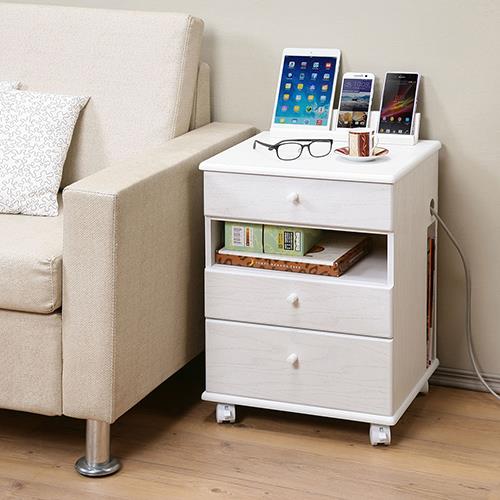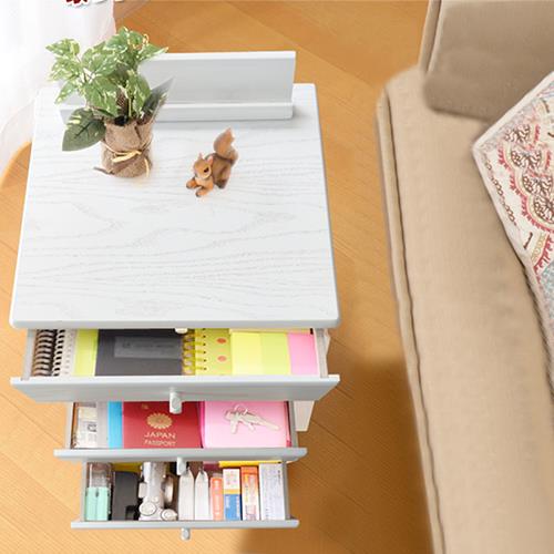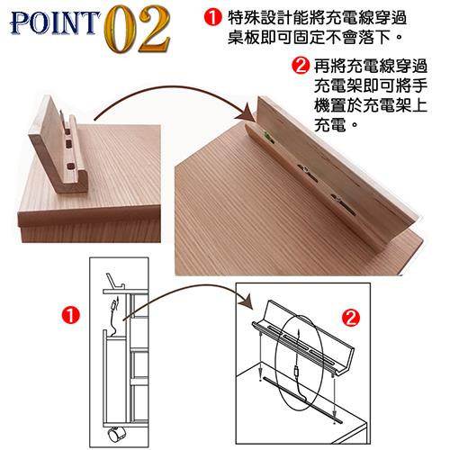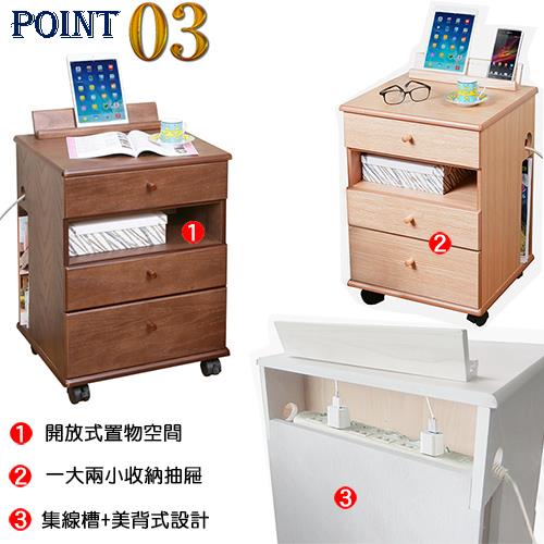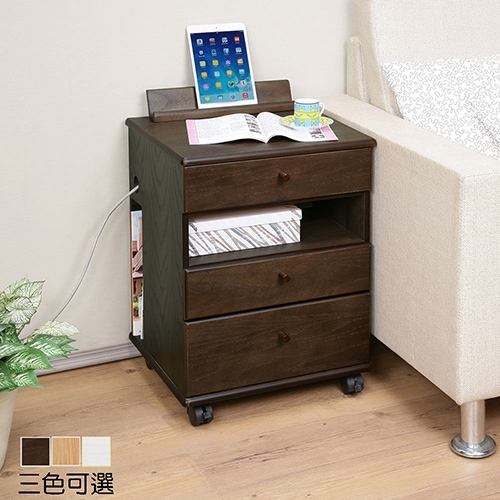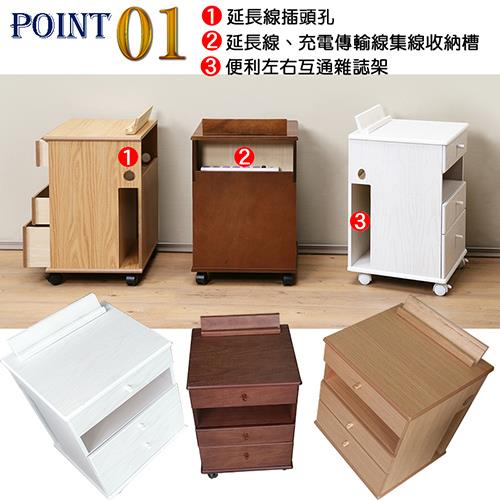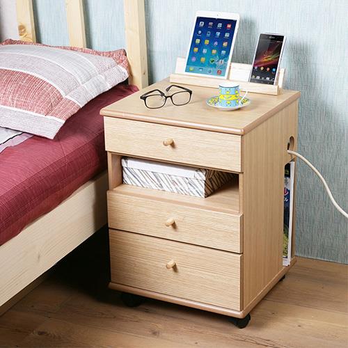 正面一大兩小抽+開放置物格,只是床頭邊櫃的基本功能而已,擁有多種3C商品已變成現代人生活中不可或缺的必需品,但越來越多的充電器、傳輸線等等雜亂無章且糾結的纜線已經霸佔您家插座的周圍而顯得凌亂不堪,這款《設計家》座充日式床頭邊桌櫃的巧妙之處就在於背後,我們設計了可放置延長線插座的集線槽與配線孔,方便您使用3C產品的座充,高度足足16公分適合各種充電頭,而桌板更有獨家設計的線槽與擋板,讓您的充電線可以穿越桌板以及充電架而不會往下脫落,當您心愛的手機與平板要充電時僅需要放置於充電架上,接上充電線即可輕輕鬆鬆充電,手機或平板充電的時候就像是在展示區一般能夠排排站著充電,讓您擺脫各種線材雜亂纏繞的空間!