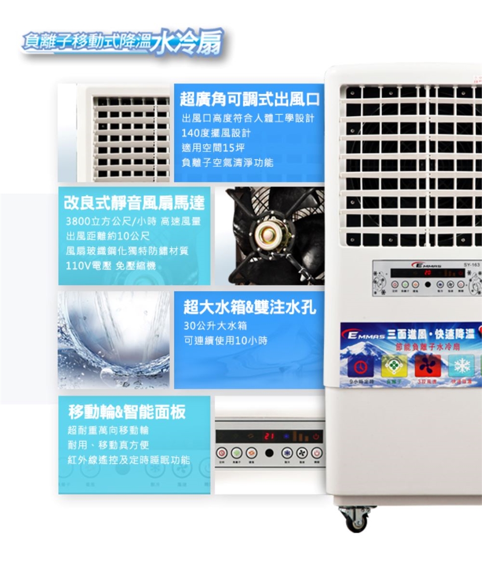 電子控制機板,紅外線遙控器操作,面板輕易顯示出風處溫度,三段式風速調整,達大坪數空間使用,搭配冷氣一同使用降溫效果更加倍。SY-163不僅是水冷扇功能,同時具備負離子功能,有遇過家裡地板因風面氣流關係,造成地板都是潮溼,只要將機器啟動電源(不要開啟製冷功能),即能有效達到降低環境受潮功能。