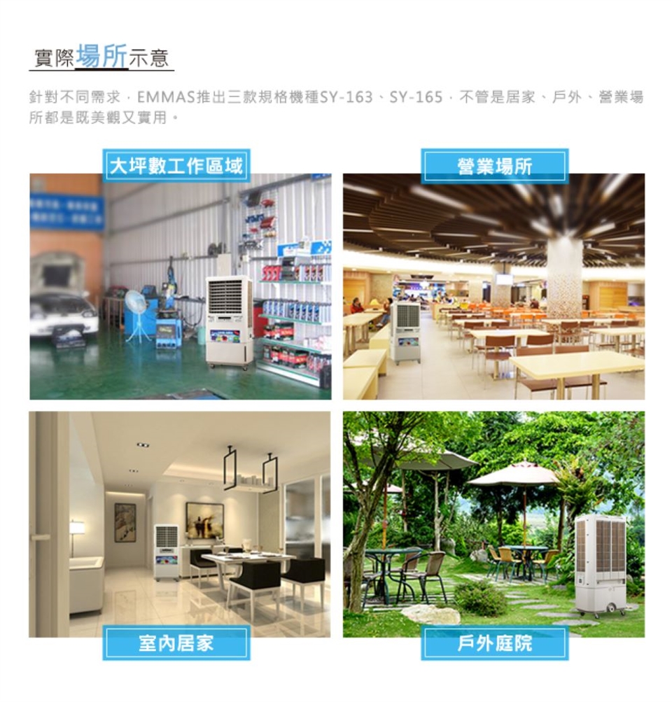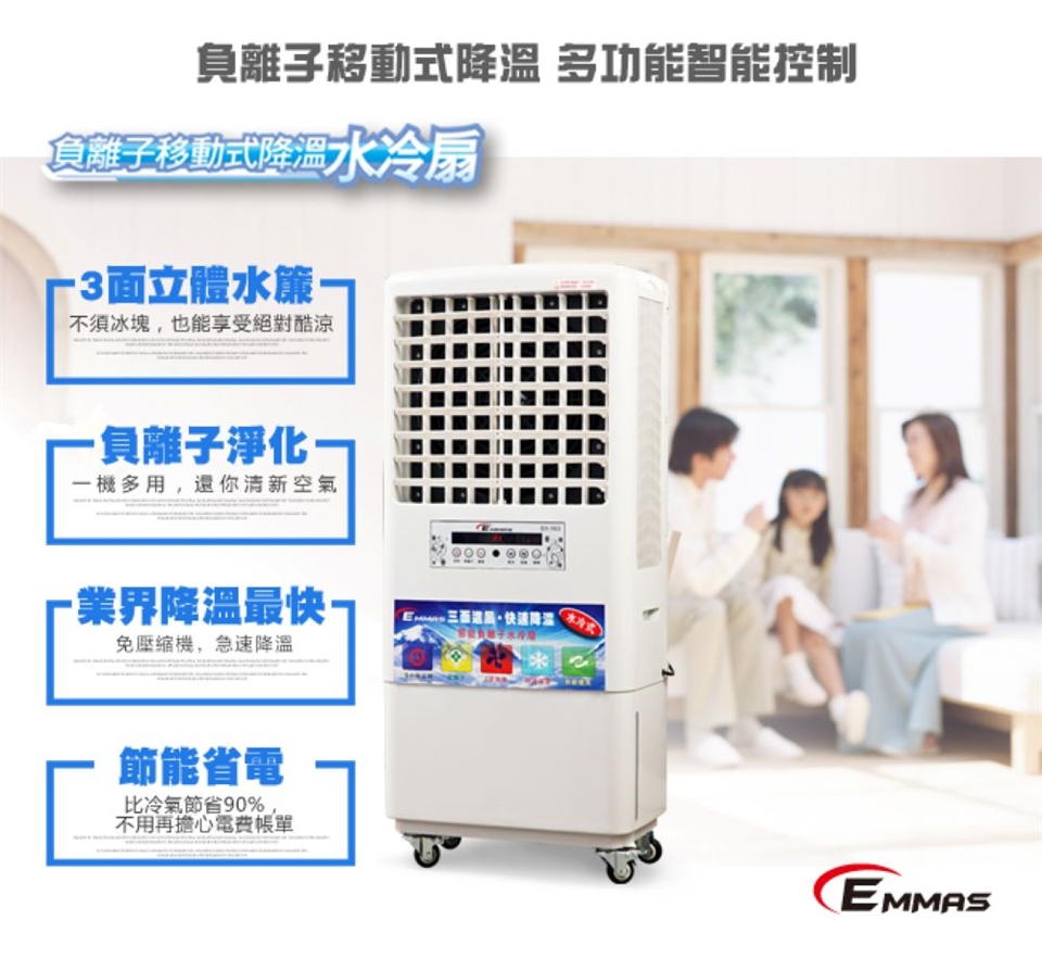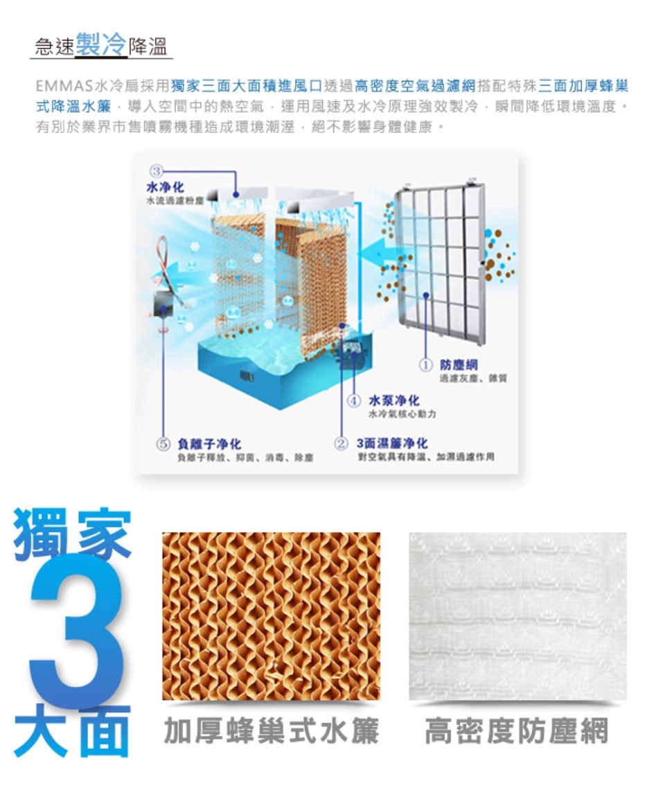 EMMAS水冷扇採用風速及水冷原理強效製冷,絕不採用業界市售噴霧機種造成環境潮溼,絕不影響身體健康,EMMAS是真正可讓您空間溫度實際降溫,全新改良進化機種從外而內不僅將馬達轉速上及安靜度上改良,風扇支架也採用玻纖鋼化防鏽材質,防止內部零組件生鏽,維持商品零組件壽命,外型設計上也利用多點出風設計,使環境空間多坪面積及人體溫度均能有效降溫。