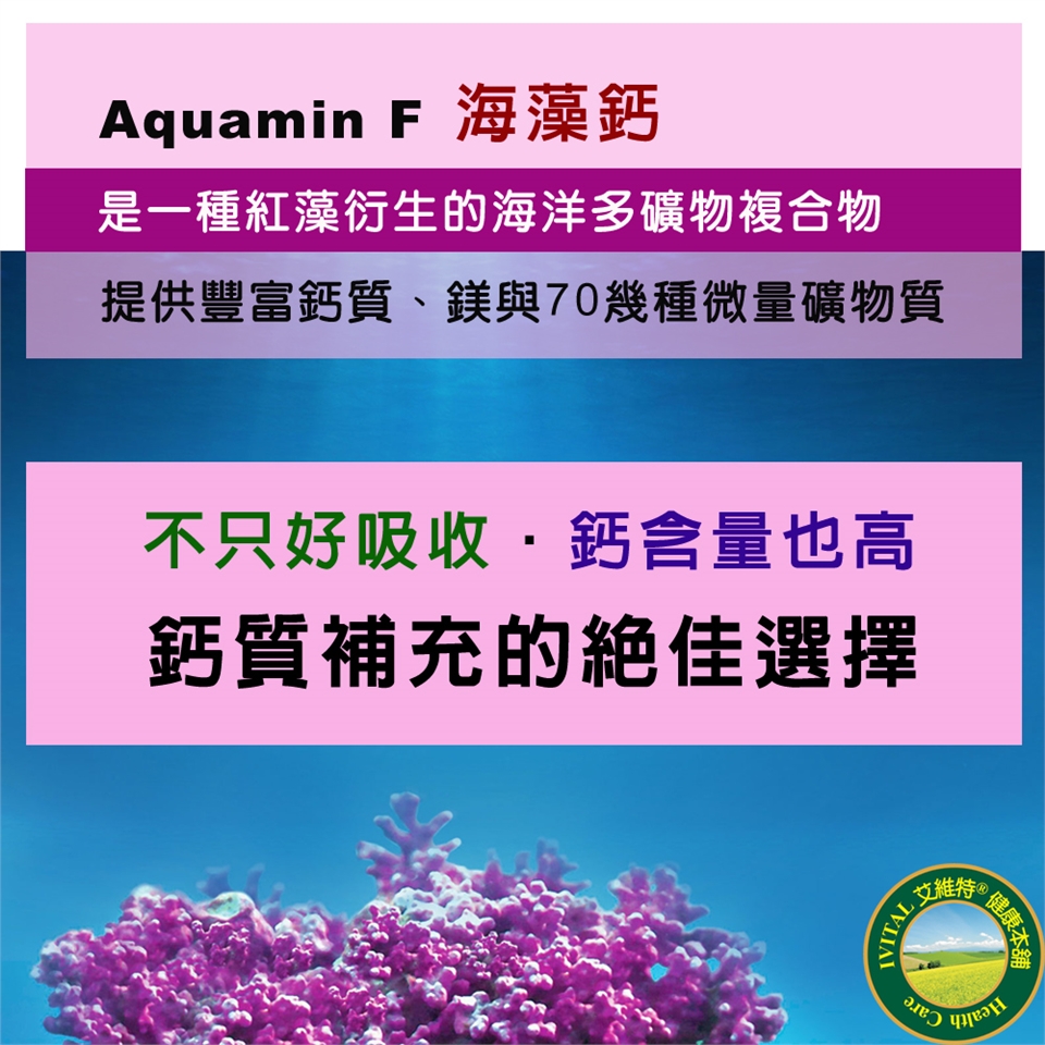 Aquamin F是一種多礦物質的獨特海藻衍生礦源,Aquamin F中含有豐富的鈣質,鎂和其它70種以上微量礦物質,包括鋅,鐵和硒。它是從紅藻萃取而來的,Lithothamnion的物種,這在世界上有三個地方,其中包括愛爾蘭和冰島的西南海岸發現。在其成長階段,這些藻類從海洋裡吸收了重要的礦物質元素,這讓Aquamin擁有獨特的多礦物質含量。紅藻經自然分解,沉積在海床,這些鈣化的紅藻被採收,洗淨,曬乾,研磨,研製出鈣含量豐富的Aquamin F,生產過程中沒有再添加其它的成份,是極佳的鈣質補充來源。