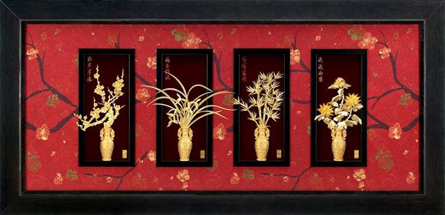 四方和氣:東西南北四方,皆能和和氣氣,凡事皆能和氣生財 東西南北四方皆有搖錢樹並開枝散葉(表生意蓬勃發展 ,財源滾滾!) 梅、蘭、竹、菊,是我國傳統繪畫中常見的重要題材,稱為“四君子”。君子,指的是品德高尚的人,把梅、蘭、竹、菊稱為“君子”,雖然是比喻和象徵,然而,梅花頂風冒雪,在嚴寒中綻放;蘭花幽雅恬靜,散發著淡淡的清香;竹子青翠挺拔,“勁節虛心”;菊花笑傲西風,迎霜盛開,這四種觀賞植物確實有著它們的獨特品格,值得人們喜愛,喻為君子,順理成章。 梅-梅步早春(喜上眉稍): 梅花是中國傳統名花,它不僅是清雅俊逸的風度使古今詩人畫家為它讚美,更以它的冰肌玉骨、凌寒留香被喻為民族的精華而為世人所敬重。中國歷代文人志士愛梅、頌梅者極多。梅即以它的高潔、堅強、謙虛的品格,給人以立志奮發的激勵。在嚴寒中,梅開百花之先,獨天下而春,因此梅又常被民間作為傳春報喜的吉祥象徵。 蘭-蘭香怡德(招好人緣): 蘭花是幽香清遠,一枝在室,滿屋飄香。蘭花以它特有的葉、花、香獨具四清氣清、色清、神清、韻清給人以極高潔、清雅的優美形象。古今名人對它品價極高,被喻為花中君子。在古代文人中常把詩文之美喻為「蘭章」,把友誼之真喻為「蘭友」,把良友喻為「蘭客」。 竹-節節高昇(竹報平安): 竹青翠挺拔,奇姿出眾,每當寒露突降,百草枯零時,竹卻能臨霜而不凋,可謂四時長茂,人們賦予它性格堅貞,至高萬丈的高風亮節,和虛心向上,風度瀟灑的「君子」美譽。在民間傳統中有用放爆竹以除舊迎新、除邪惡報平安的習俗。所以竹在中國的裝飾繪畫上亦被作為平安吉祥的象徵。 菊-欣欣向榮(吉祥長壽): 雋美多姿,然不以嬌艷姿色取媚,卻以素雅堅貞取勝,盛開在百花凋零之後。人們愛它的清秀神韻,更愛它凌霜盛開,西風不落的一身傲骨。古神話傳說中菊花又被賦予了吉祥、長壽的含意。如菊花與喜鵲組合表示「舉家歡樂」;菊花與松樹組合為「益壽延年」等,在民間應用極廣。 【藝術生活化】一直以來都是《雅鑑鑫品》所追求的目標,將傳統紙雕與高貴的金箔相結合、也一直是我們的願望。 《雅鑑鑫品》經過長時間的構思與研發,終於克服種種困難,推出《雅鑑鑫品》立體金箔畫系列產品。製作一幅立體金箔畫比想像中難多了,需要花上很長時間。首先要經過嚴格選材,取材,創意構思,完成素描稿,確定整體效果,再經過立體思維方式,將畫面分割成數以千計小塊,並運用傳統的剪、刻、捏、膠等不同手法,再經過上千次人手工序,嚴謹製作而成。 |