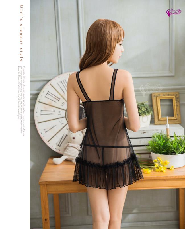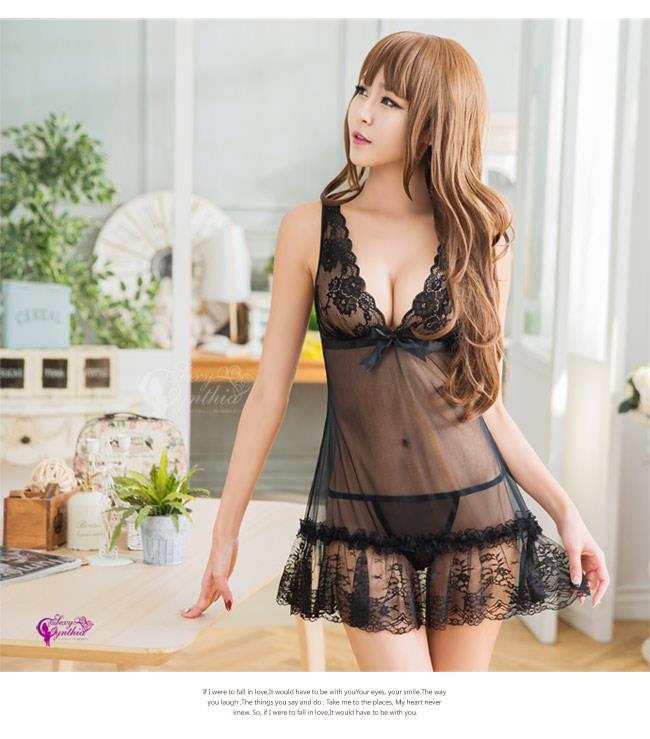 胸前蕾絲深V剪裁,以緞帶圍繞著~