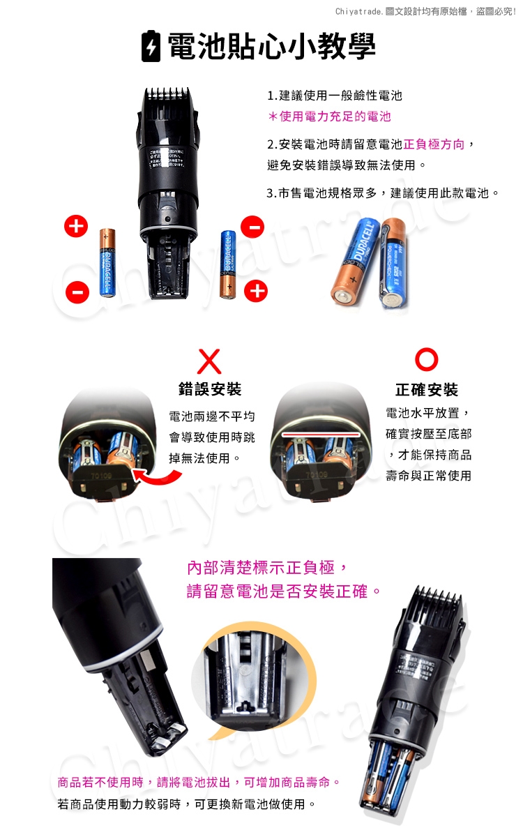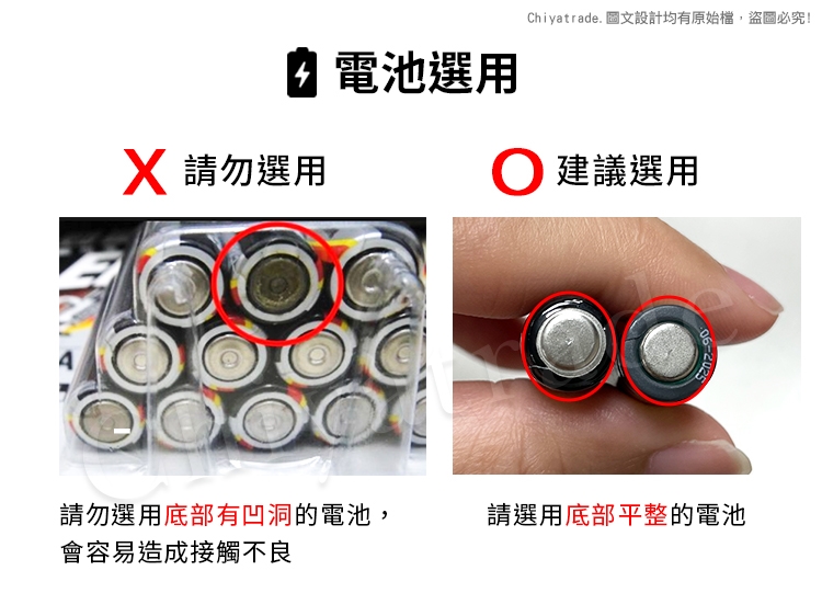 ※請勿選用底部有凹洞的電池,會容易造成接觸不良。