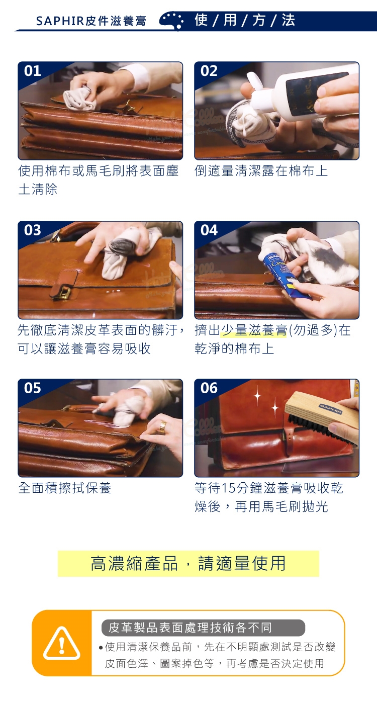 2.皮革製品表面處理技術各不同,使用清潔保養品前,