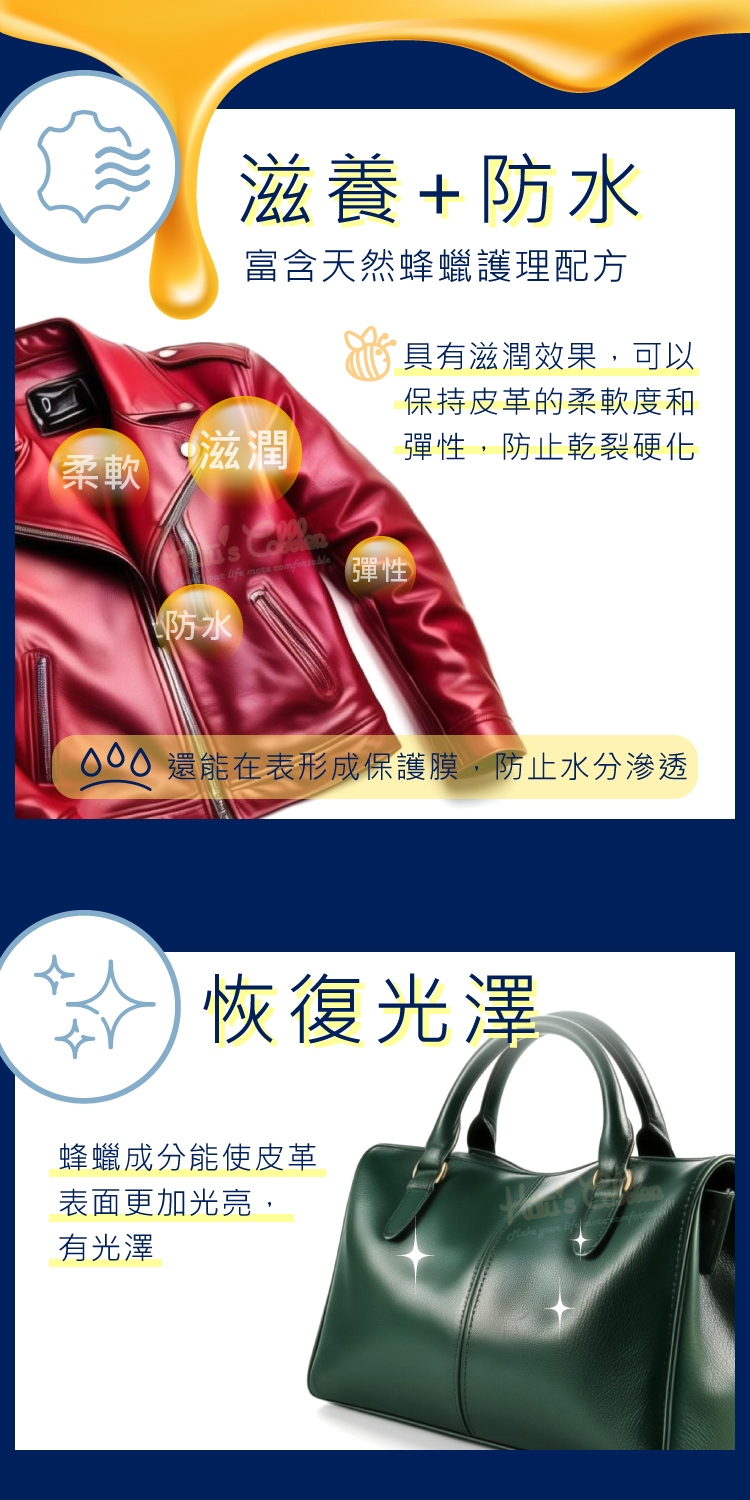 恢復光澤:蜂蠟成分能使皮革表面更加光亮,有光澤