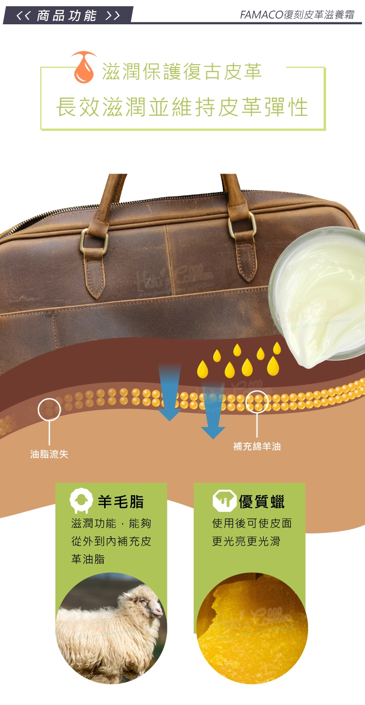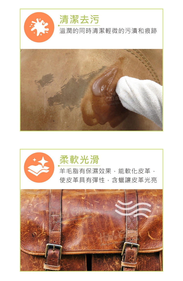 獨特的羊毛脂配方,滋潤功能,能夠從外到內補充皮革油脂