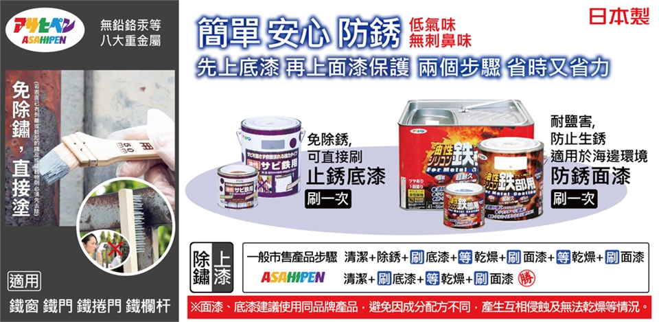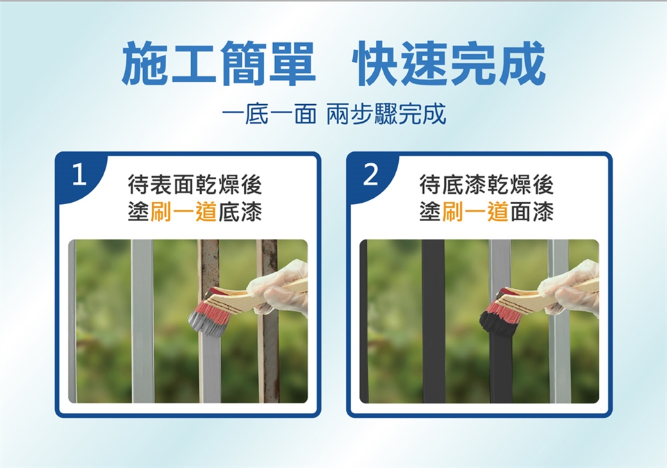 4.已生銹或濕氣重及室外鐵製品須先加塗本品牌的防銹(或止銹)底漆(另購)隔1~2日(冬天隔2~3天)再重塗一次。