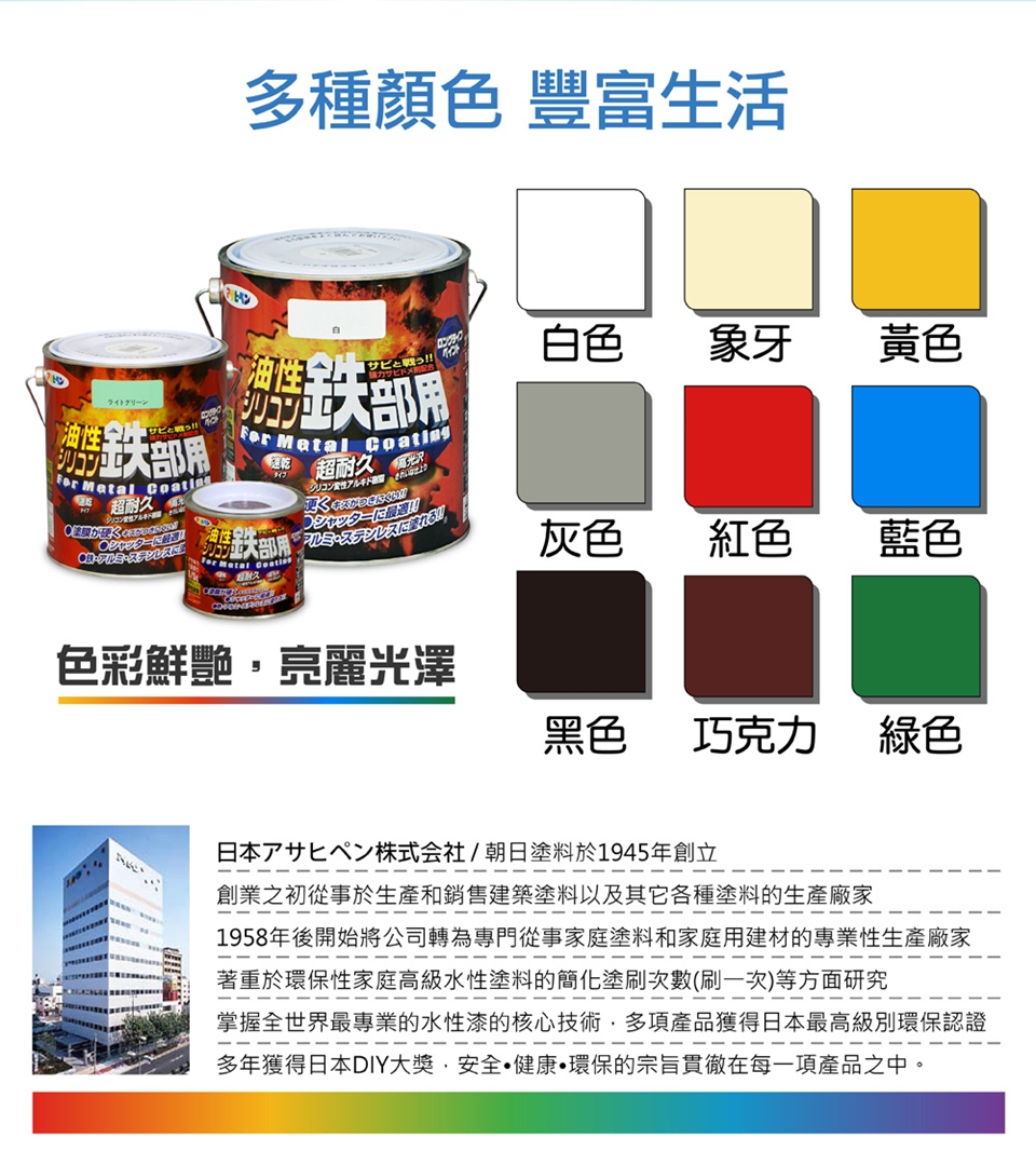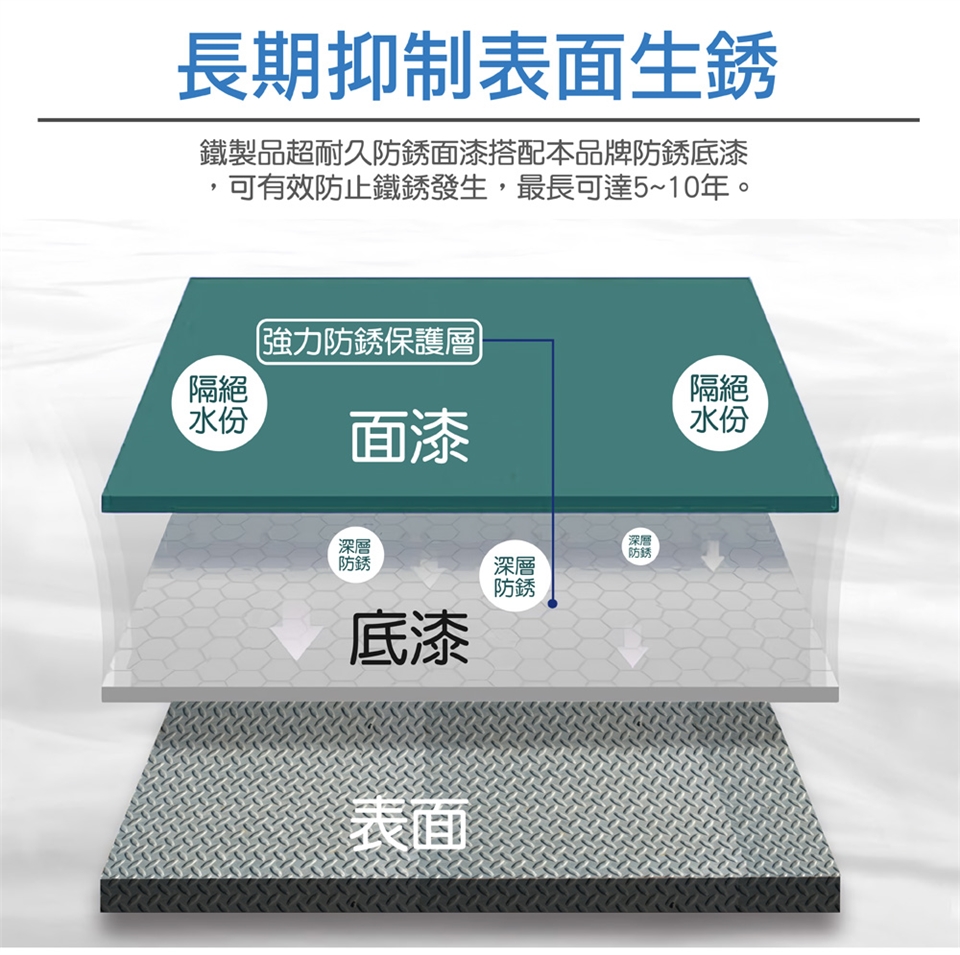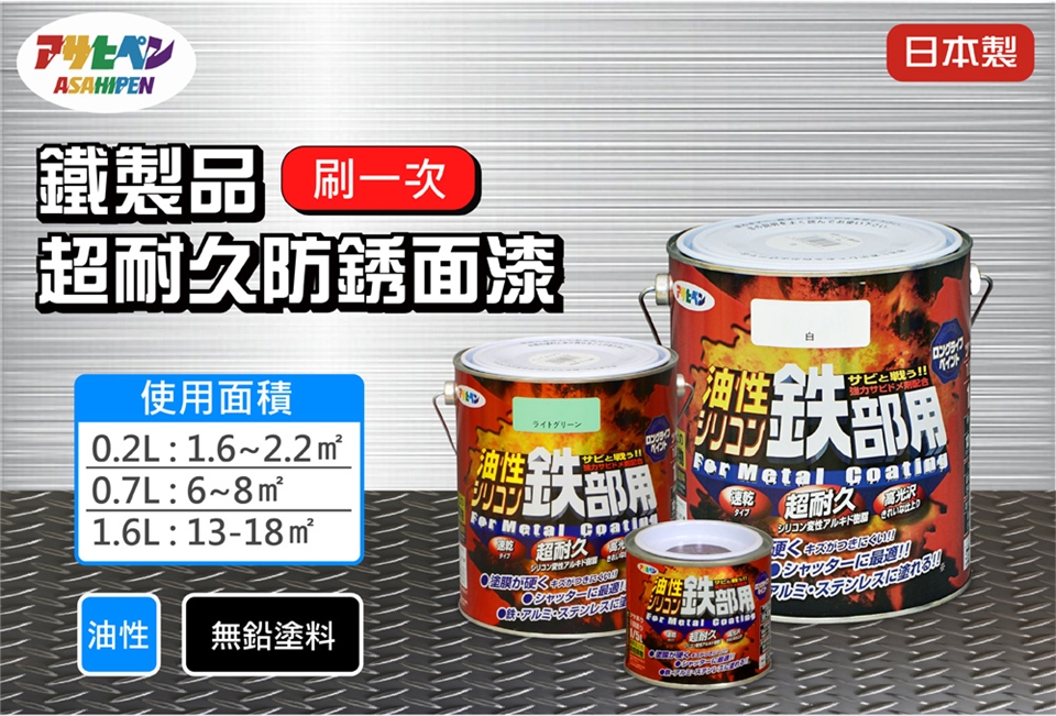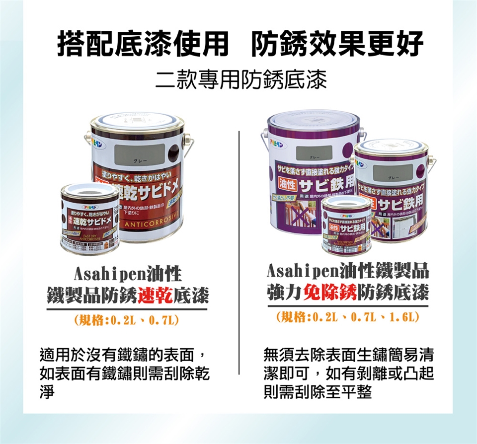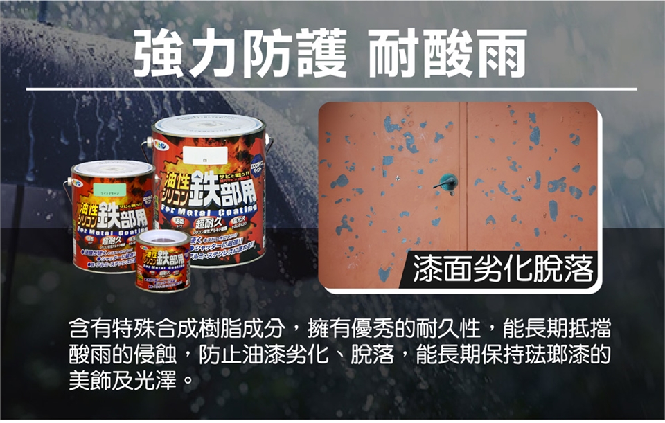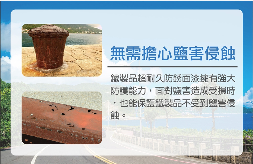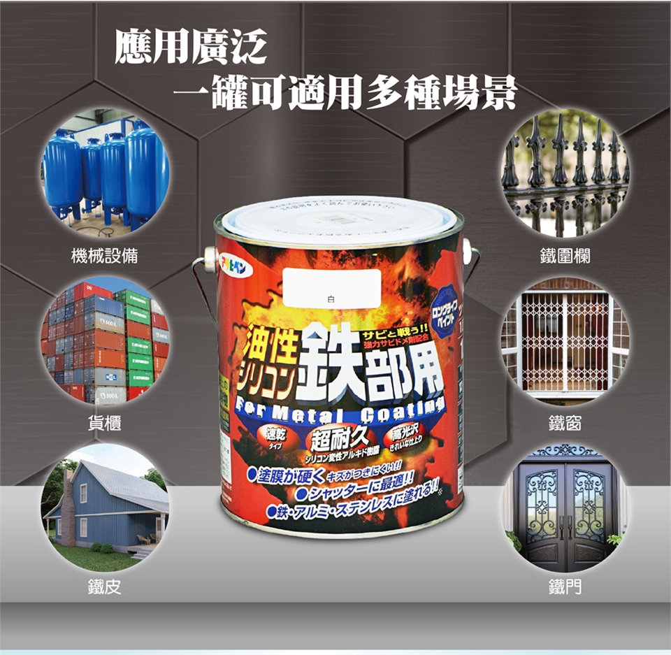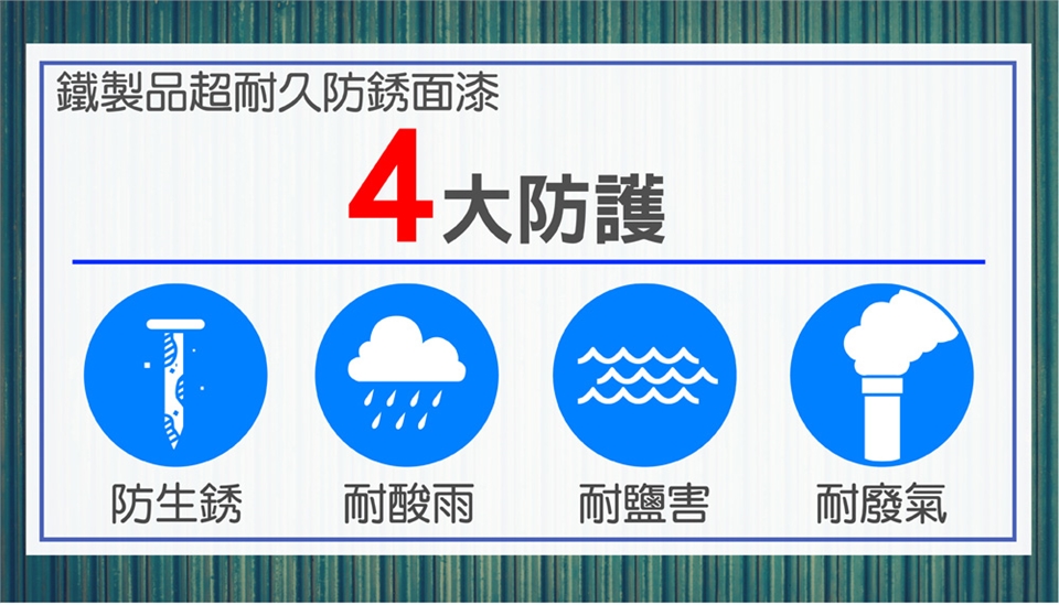 ●含強力防銹劑,能長期防銹。室外鐵器均須先加塗底漆,防銹效期可達5-10年