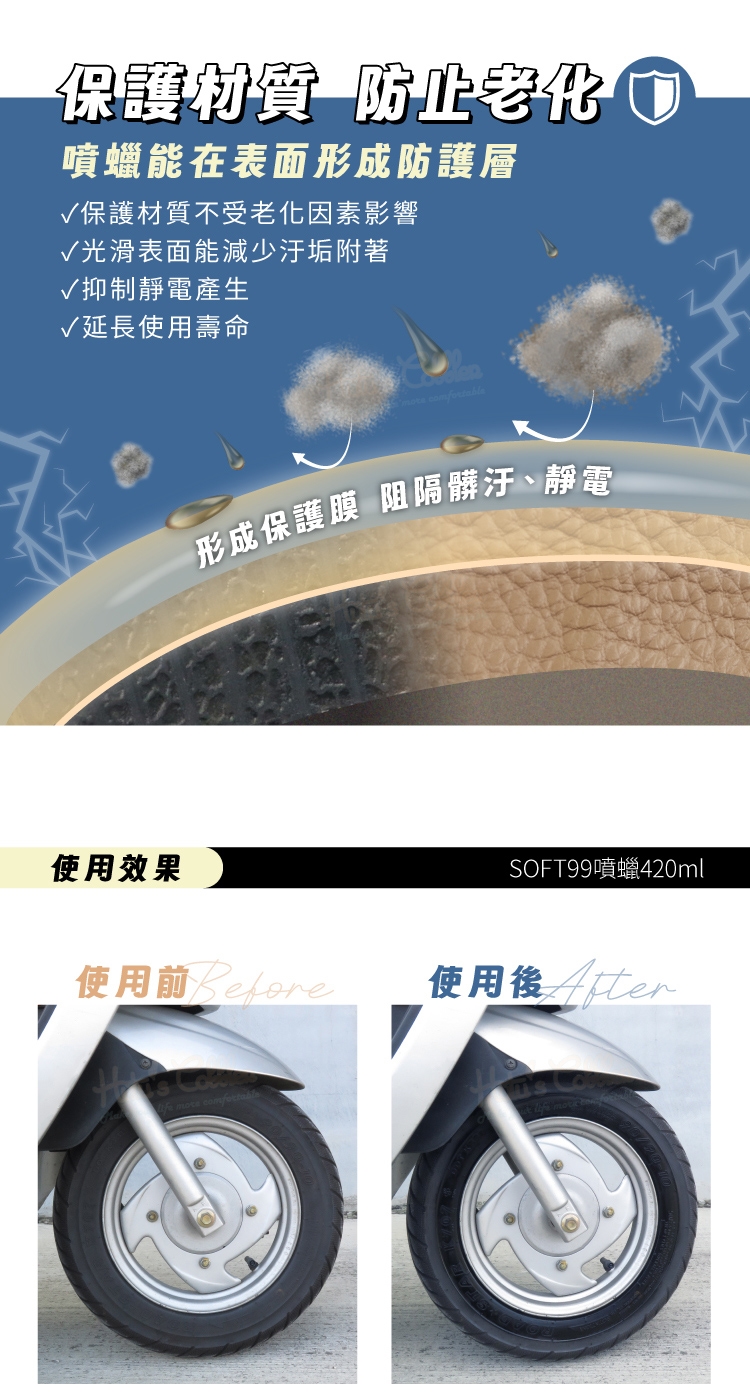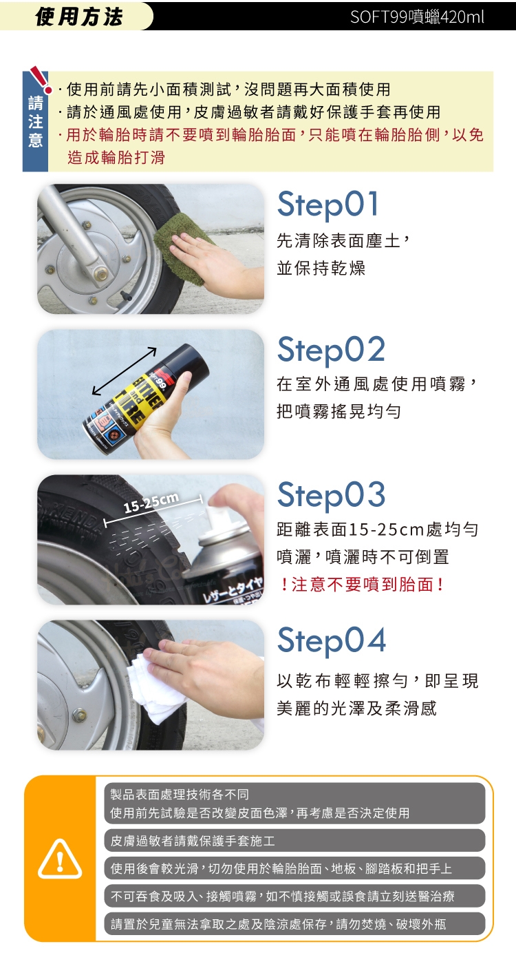 !用於輪胎時請不要噴到輪胎胎面,只能噴在輪胎胎側,以免造成輪胎打滑!