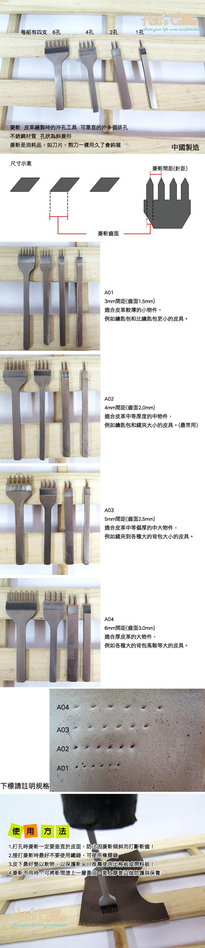 1.打孔時菱斬一定要垂直於皮面,防止因菱斬傾斜而打斷斬齒!