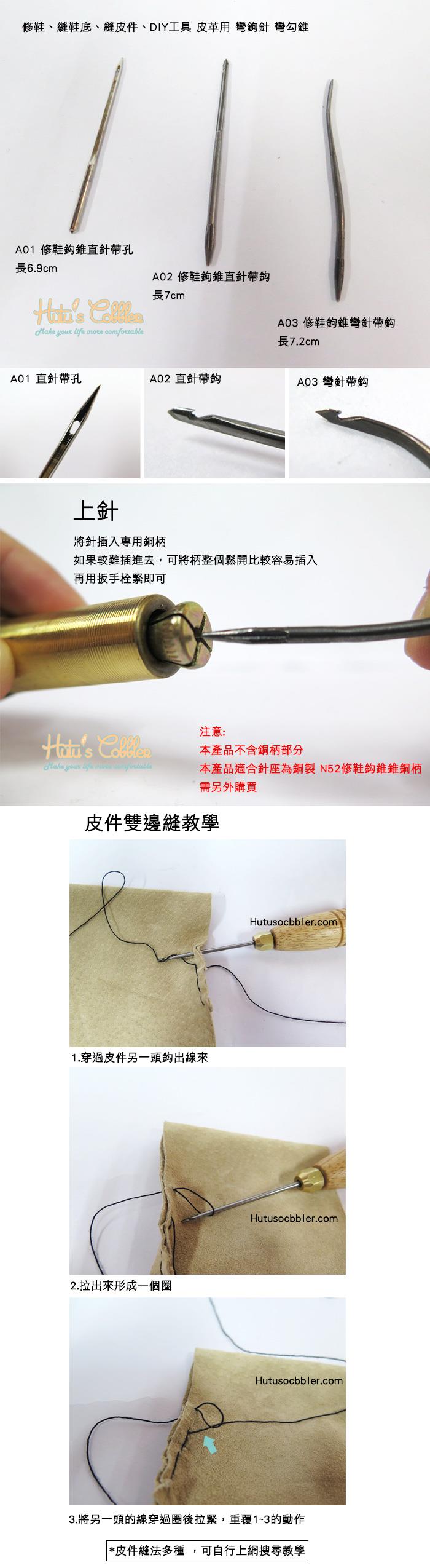 商品詳細介紹 使用方法說明 皮件雙邊縫教學 1.穿過皮件另一頭?出線來2.拉出來形成一個圈3.將另一頭的線穿過圈後拉緊,重覆1~3的動作 皮件縫法多種 ,可自行上網搜尋教學木柄需另外購買 N52銅柄 注意事項 無